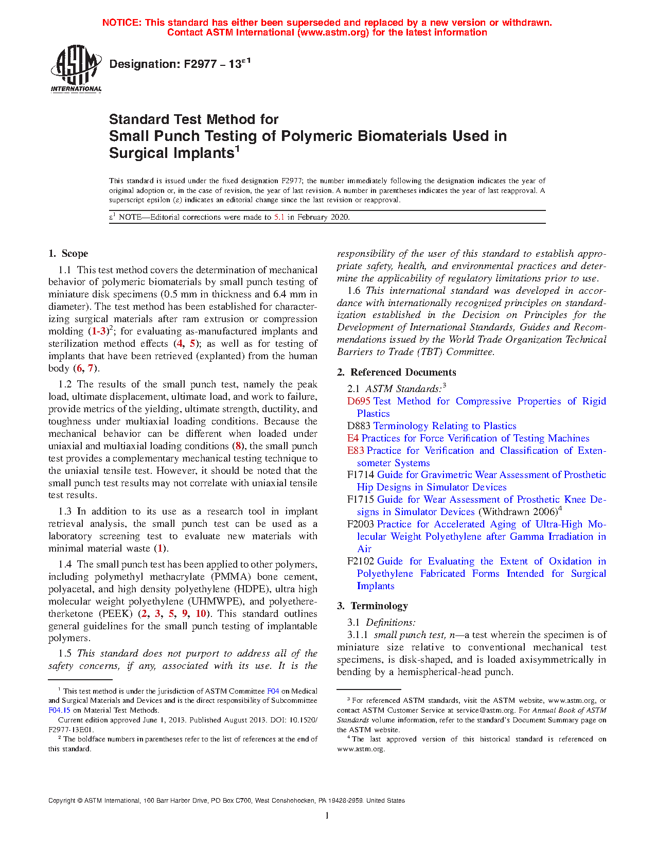 1.1 This test method covers the determination of mechanical behavior of polymeric biomaterials by small punch testing of miniature disk specimens (0.5 mm in thickness and 6.4 mm in diameter). The test method has been established for characterizing surgical materials after ram extrusion or compression molding (1-3)2; for evaluating as-manufactured implants and sterilization method effects (4, 5); as well as for testing of implants that have been retrieved (explanted) from the human body (6, 7).