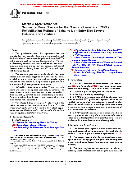 1.2 The segmental panel system produced under this specification is for non-pressure applications where the PVC liner is installed in the existing structure and the annular space between the liner and the existing structure is grouted with a low viscosity, high strength cementitious grout.