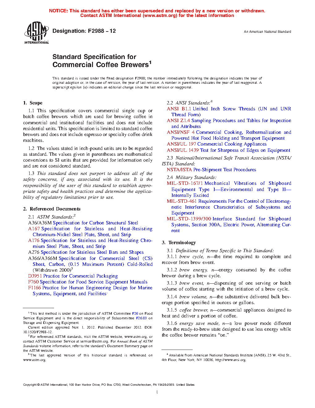 This specification covers commercial single cup or batch coffee brewers which are used for brewing coffee in commercial and institutional facilities and does not include residential units. This specification is limited to standard coffee brewers and does not include espresso or specialty coffee drink machines. Materials used in the construction of the machine shall comply with NSF No. 4 and UL Standard 197. Unless otherwise specified, all hardware and fittings shall be corrosion-resistant to ASTM A167 or ASTM A176 or suitably processed to resist corrosion and all threaded parts shall conform to ANSI B1.1.
