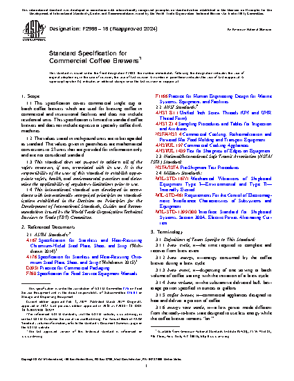 1.1 This specification covers commercial single cup or batch coffee brewers which are used for brewing coffee in commercial and institutional facilities and does not include residential units. This specification is limited to standard coffee brewers and does not include espresso or specialty coffee drink machines.