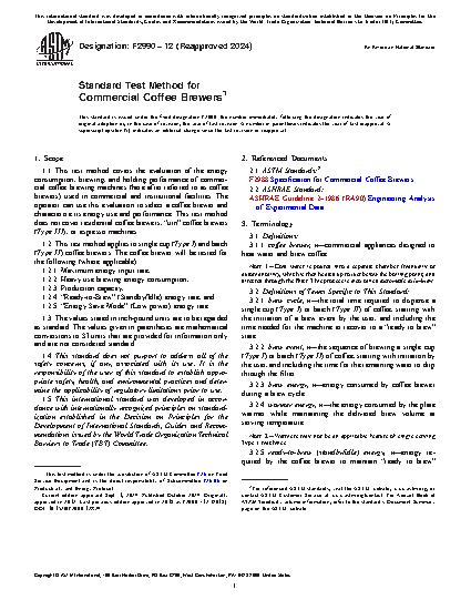 1.1 This test method covers the evaluation of the energy consumption, brewing, and holding performance of commercial coffee brewing machines (here after referred to as coffee brewers) used in commercial and institutional facilities. The operator can use this evaluation to select a coffee brewer and characterize its energy use and performance. This test method does not cover residential coffee brewers, “urn” coffee brewers (Type III), or espresso machines.