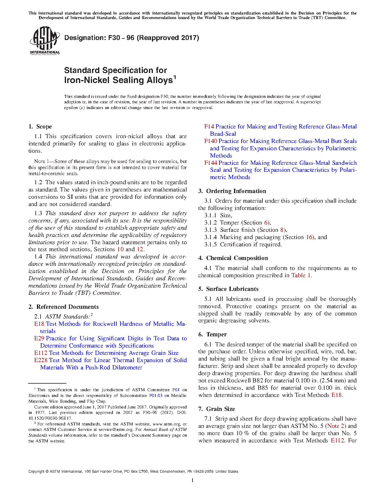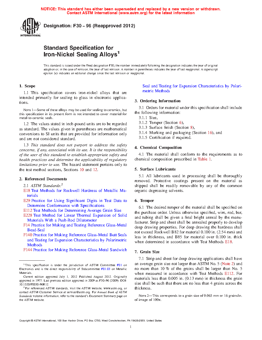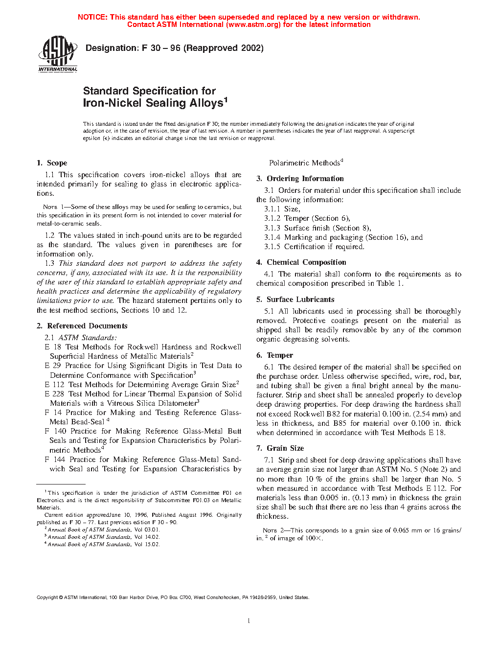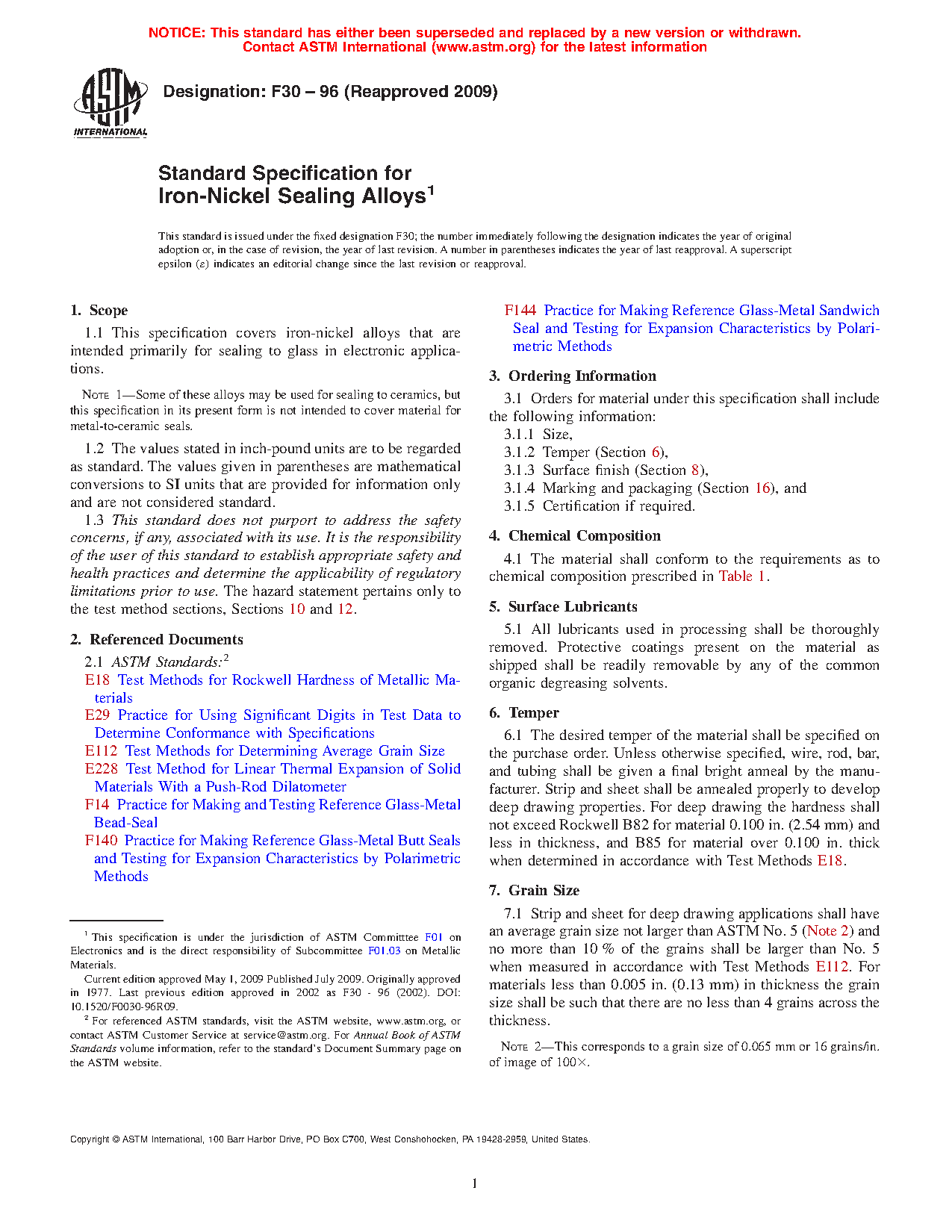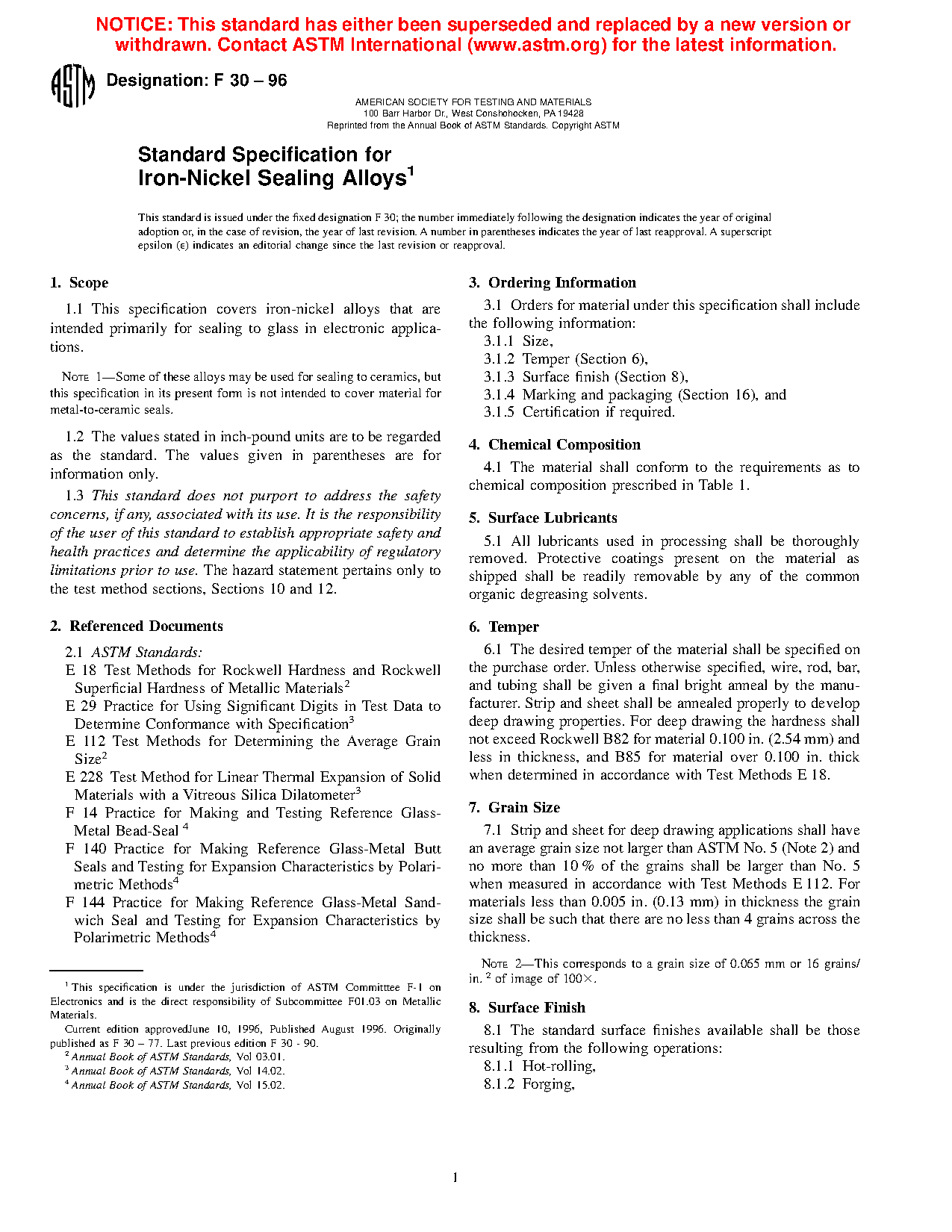 This specification covers the characteristics and requirements for iron-nickel alloys intended primarily for sealing to glass in electronic applications. The alloys shall conform to chemical composition, surface finish, temper, grain size, and thermal expansion requirements as stated herein.