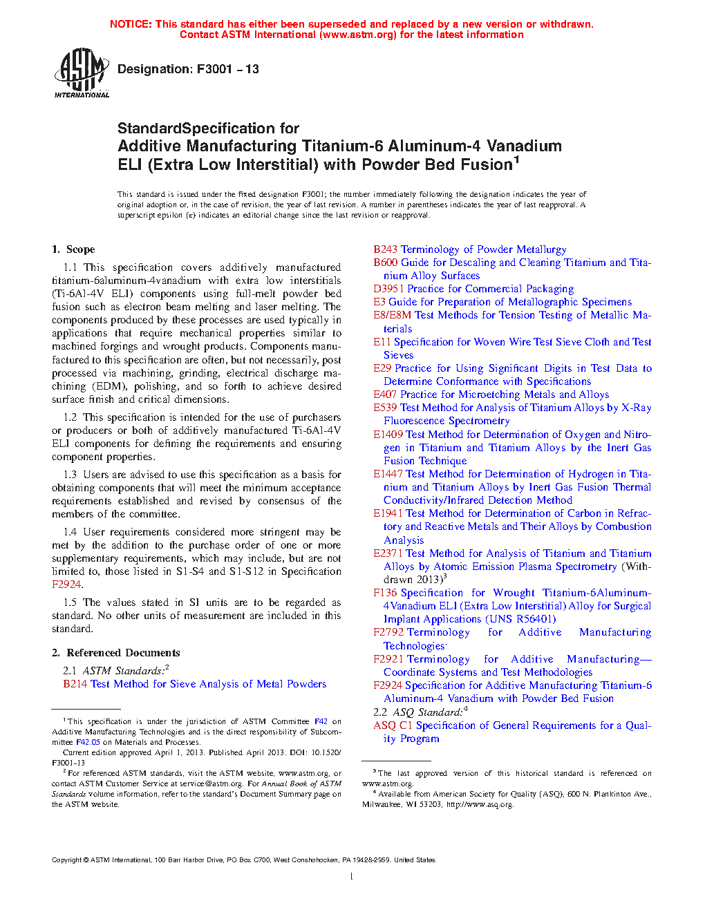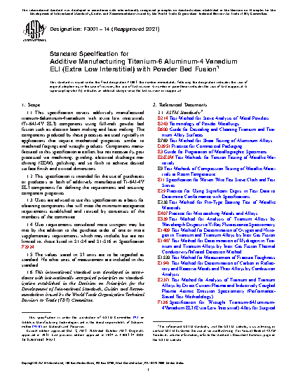 1.2 This specification is intended for the use of purchasers or producers or both of additively manufactured Ti-6Al-4V ELI components for defining the requirements and ensuring component properties.