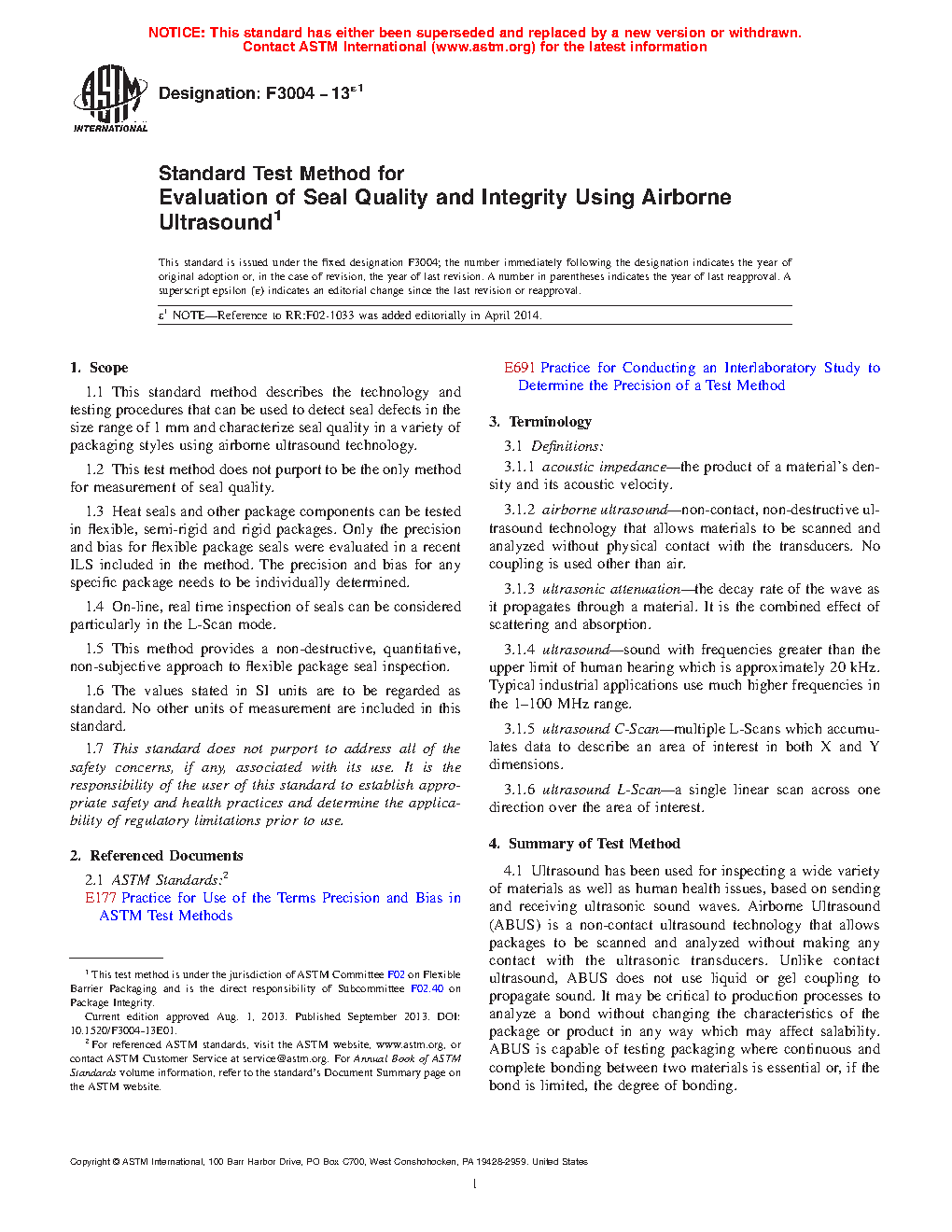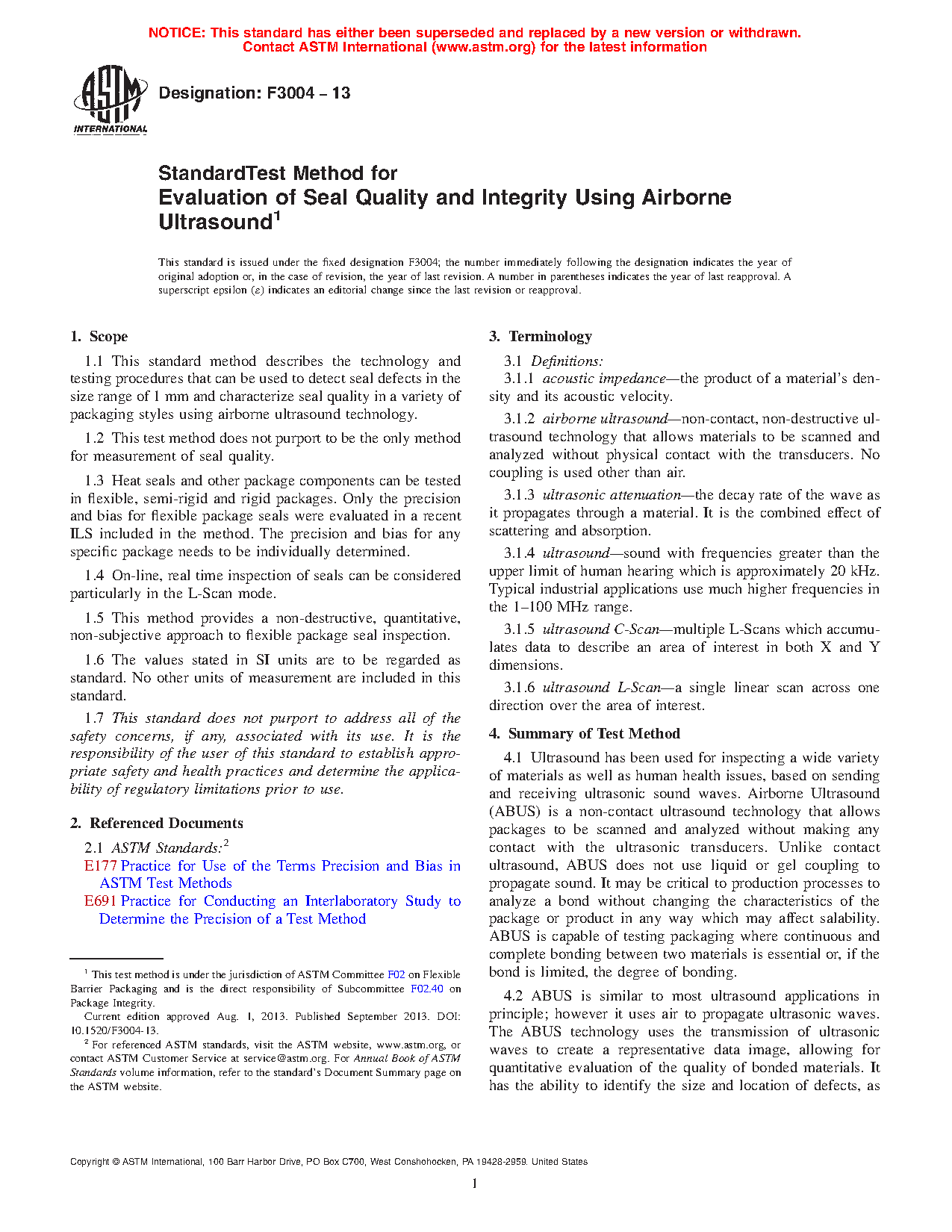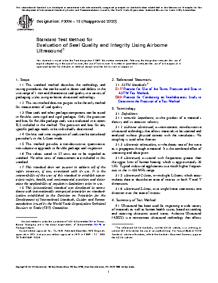1.1 This standard method describes the technology and testing procedures that can be used to detect seal defects in the size range of 1 mm and characterize seal quality in a variety of packaging styles using airborne ultrasound technology.