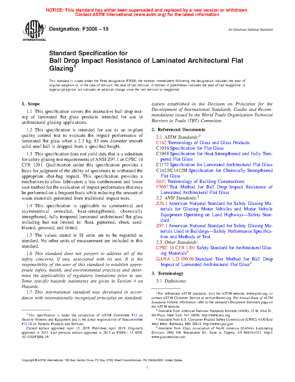 1.2 This specification is intended for use as an in-plant quality control test to evaluate the impact performance of laminated flat glass when a 2.3 kg, 83 mm diameter smooth solid steel ball is dropped from a specified height.