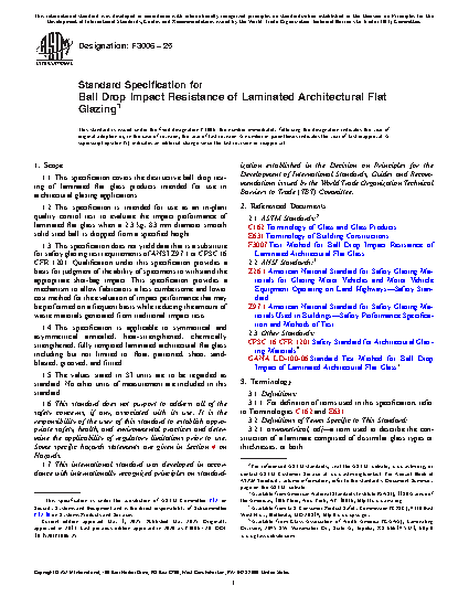 This specification is intended for the destructive ball drop testing of laminated flat glass products used in architectural glazing. It provides a basis for evaluating the impact performance of laminated flat glass when a 2.3 kg, 83 mm diameter smooth solid steel ball is dropped from a specified height. The requirements are applicable to laminated architectural flat glass products that are symmetrical and asymmetrical annealed, heat-strengthened, chemically strengthened, and fully tempered.