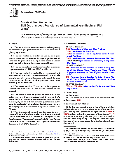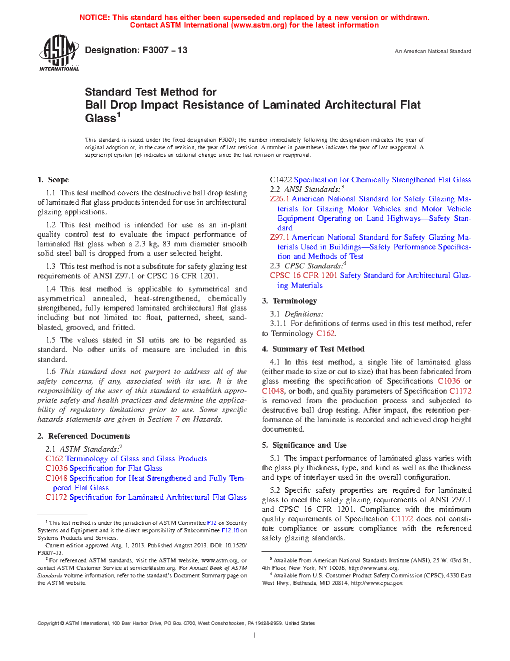 1.2 This test method is intended for use as an in-plant quality control test to evaluate the impact performance of laminated flat glass when a 2.3 kg, 83 mm diameter smooth solid steel ball is dropped from a user selected height.