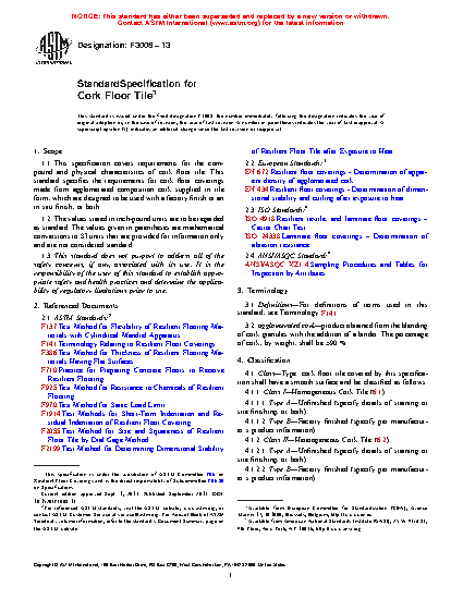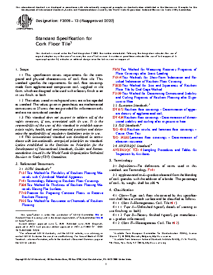 1.1 This specification covers requirements for the compound and physical characteristics of cork floor tile. This standard specifies the requirements for cork floor coverings made from agglomerated composition cork supplied in tile form, which are designed to be used with a factory finish or an in situ finish, or both.