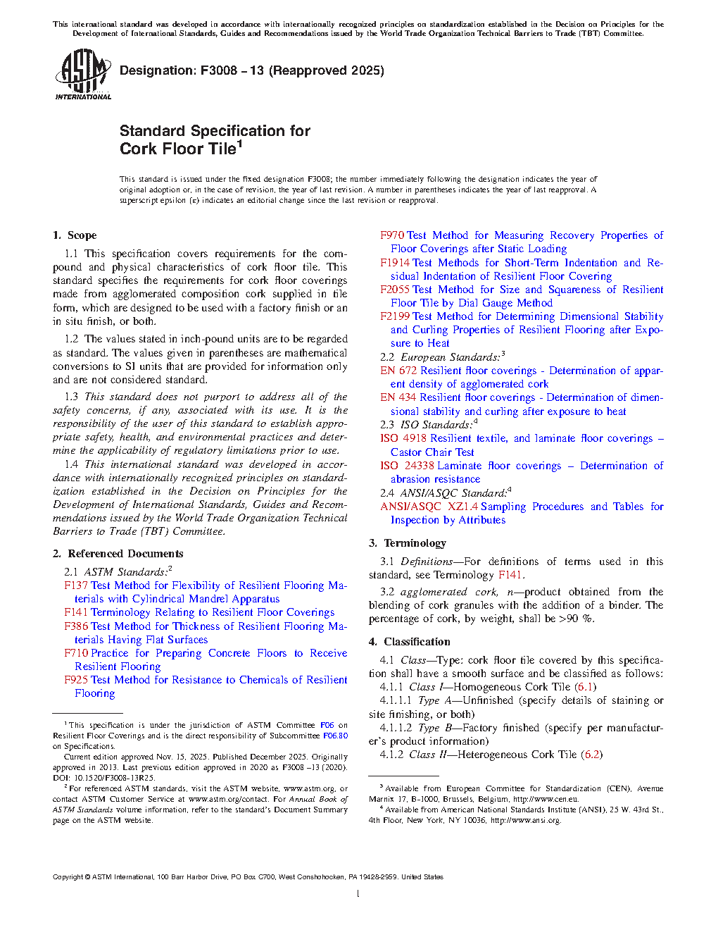 This specification defines the requirements for the compound and physical characteristics of cork floor coverings made from agglomerated composition cork supplied in tile form, to be used with a factory finish or an in situ finish, or both. Cork floor tile covered by this specification shall have a smooth surface and be classified as Class I (Types A and B) and Class II (Types A and B). The standard covers information in the invitation to bid or purchase order, materials and manufacture, physical properties, performance requirements, workmanship, finish and appearance, sampling for testing physical characteristics, inspection, certification, product marking, and packaging and package marking.
