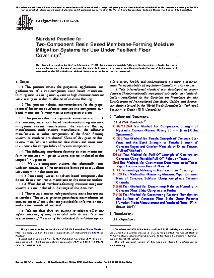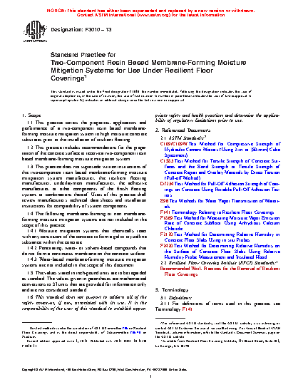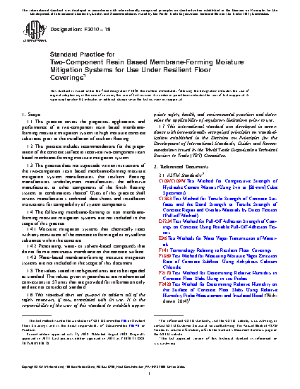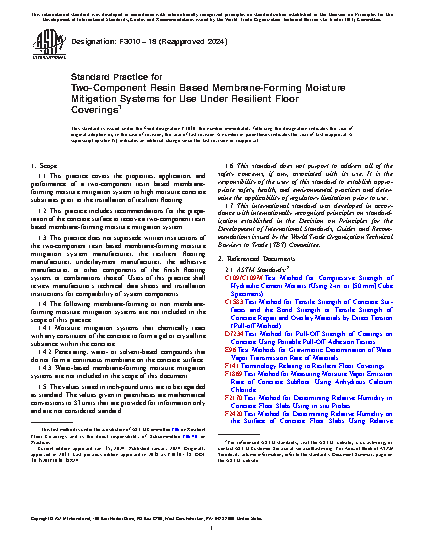 1.3 This practice does not supersede written instructions of the two-component resin based membrane-forming moisture mitigation system manufacturer, the resilient flooring manufacturer, underlayment manufacturer, the adhesive manufacturer, or other components of the finish flooring system, or combinations thereof. Users of this practice shall review manufacturer’s technical data sheets and installation instructions for compatibility of system components.