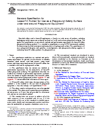 1.2 This specification does not contain test methods or performance requirements for the accessibility of loose-fill rubber playground surfacing. The specification also does not establish test methods or performance requirements to characterize the release of organic chemicals from loose-fill rubber intended to be used as a playground surface. Appendix X1 and Appendix X2 contain additional information on these topics.