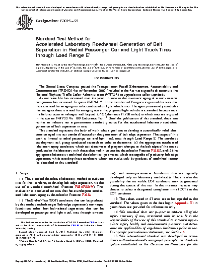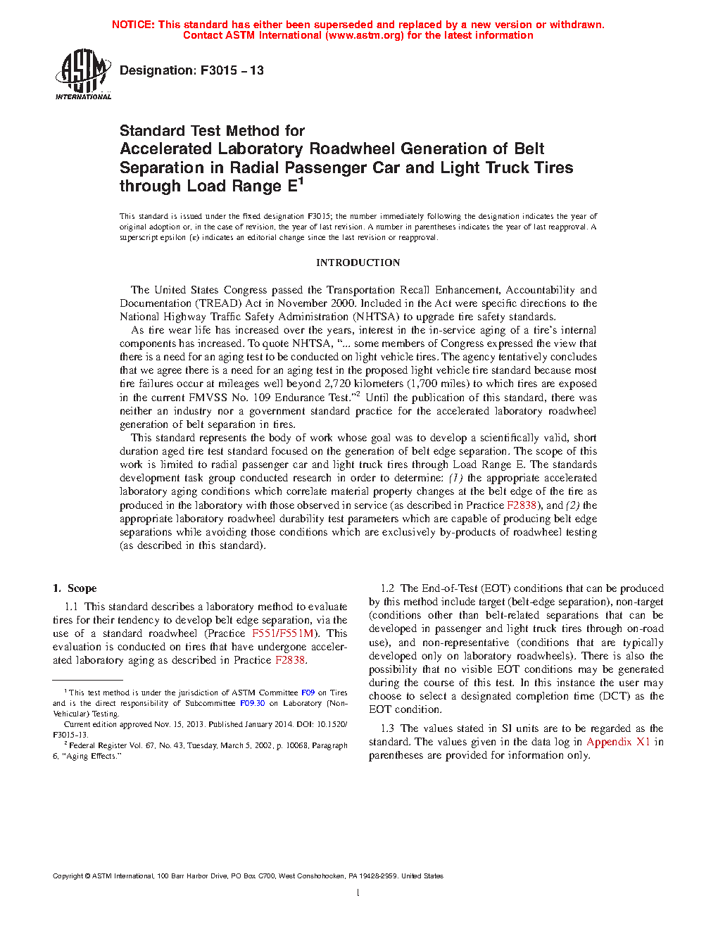 1.1 This standard describes a laboratory method to evaluate tires for their tendency to develop belt edge separation, via the use of a standard roadwheel (Practice F551/F551M). This evaluation is conducted on tires that have undergone accelerated laboratory aging as described in Practice F2838.