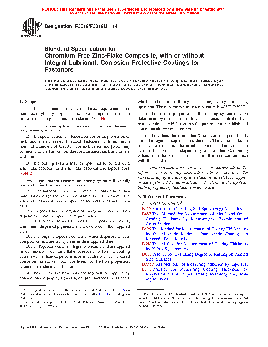 This specification establishes the basic requirements for non-electrolytically applied zinc-flake composite corrosion protective coating systems for fasteners. The requirements apply to appearance, adhesion, corrosion resistance, blisters, thread fit, hydrogen embrittlement, and total coefficient of friction. The coating systems covered by this specification do not contain hexavalent chromium, lead, cadmium, or mercury. This specification is intended for corrosion protection of inch and metric series threaded fasteners as well as for non-threaded fasteners such as washers and pins. This specification also covers test methods, application, inspection, and certification.