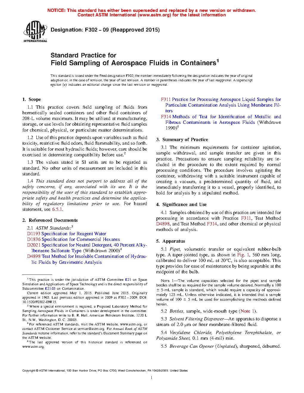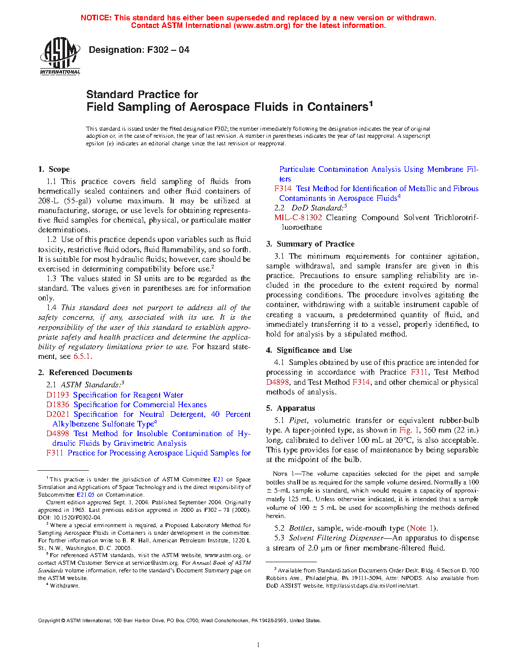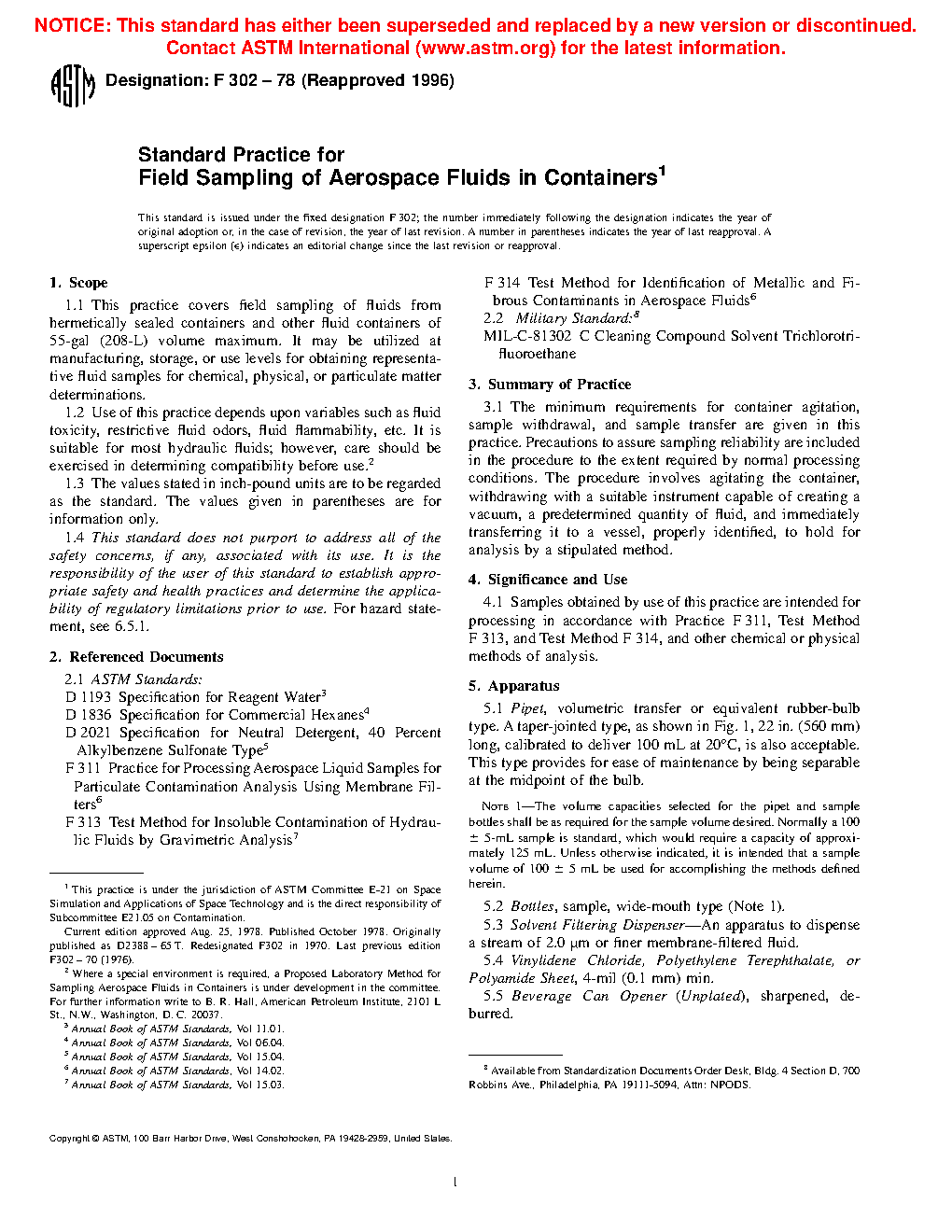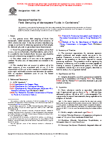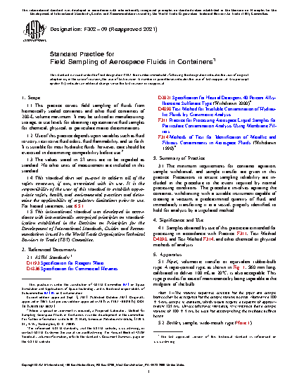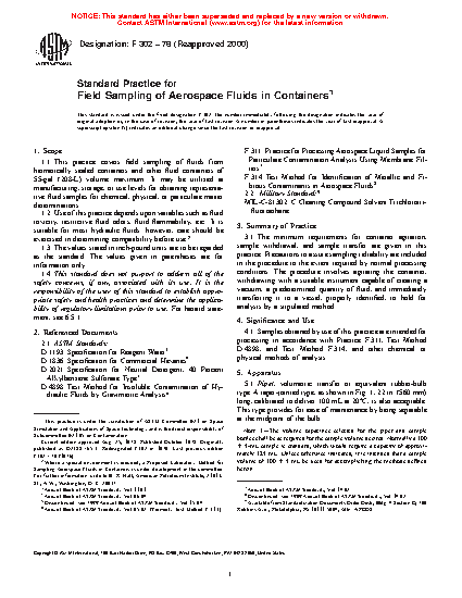 1.1 This practice covers field sampling of fluids from hermetically sealed containers and other fluid containers of 208-L volume maximum. It may be utilized at manufacturing, storage, or use levels for obtaining representative fluid samples for chemical, physical, or particulate matter determinations.