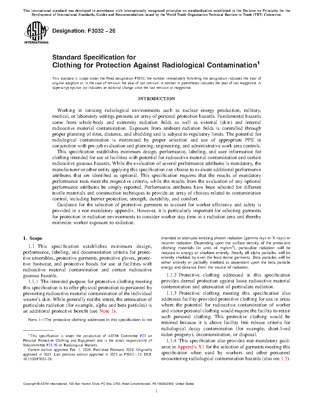 1.1 This specification establishes minimum design, performance, labeling, and documentation criteria for protective ensembles, protective garments, protective gloves, protective footwear, and protective hoods for use at facilities with radioactive material contamination and certain radioactive gaseous hazards.