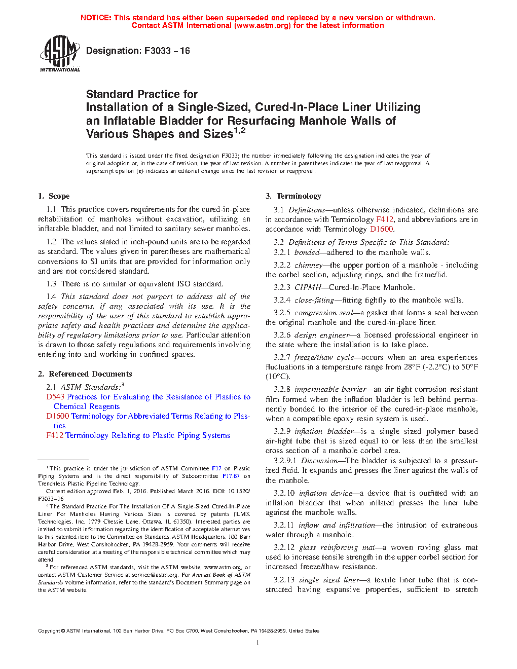 1.1 This practice covers requirements for the cured-in-place rehabilitation of manholes without excavation, utilizing an inflatable bladder, and not limited to sanitary sewer manholes.