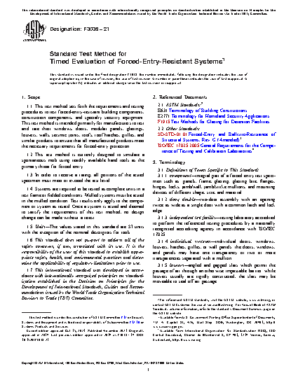 1.1 This test method sets forth the requirements and testing procedures to test forced-entry-resistant building components, construction components, and specialty security equipment. This test method is intended primarily for manufacturers to test and rate their windows, doors, modular panels, glazings, louvers, walls, seismic joints, roofs, roof hatches, grilles, and similar products to ensure that all manufactured products meet the necessary requirements for forced-entry protection.