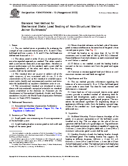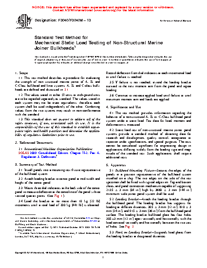 1.1 This test method describes a procedure for evaluating the strength of non structural marine joiner of A, B, and C-Class bulkhead and liner systems. A, B, and C-class bulkheads are defined and discussed in 2.1.
