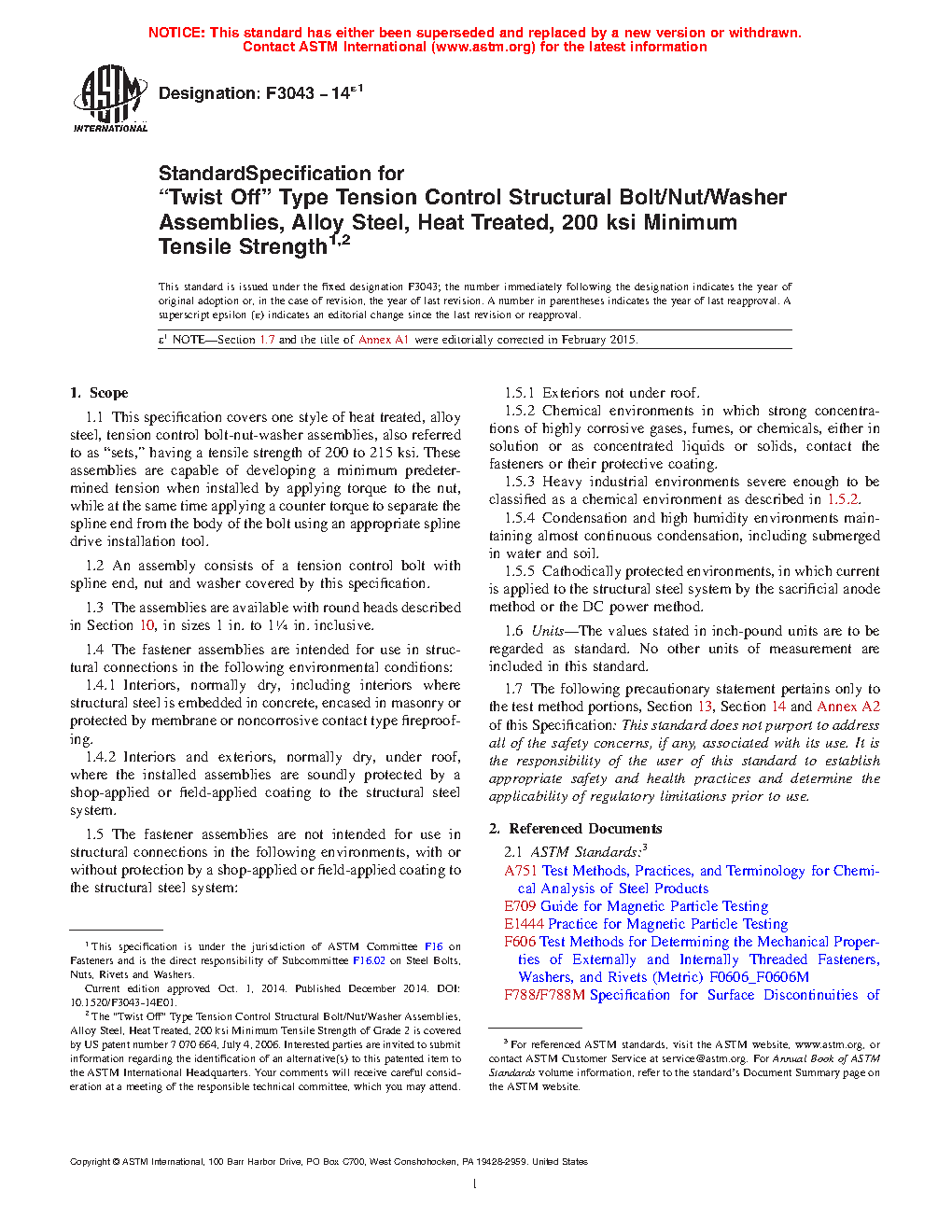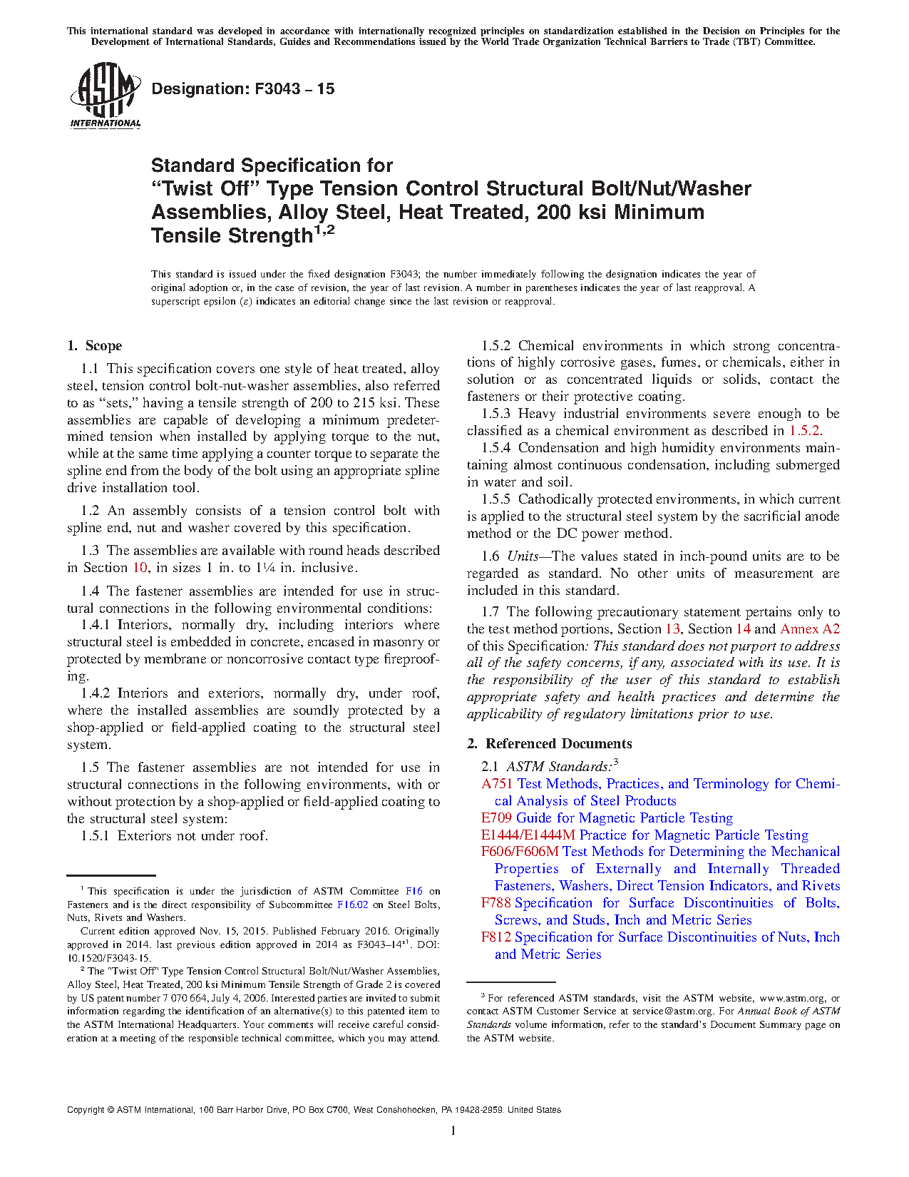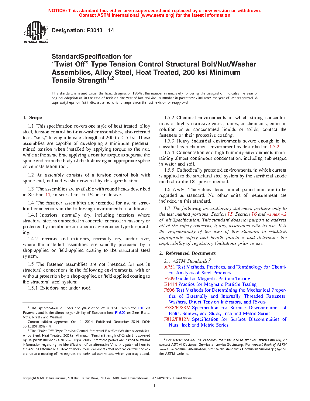 This specification establishes the basic requirements for one style of heat treated, alloy steel, tension control bolt-nut-washer assemblies, also known as "sets," having a tensile strength of 200 to 215 ksi. These assemblies are intended for use in structural connections in the following environmental conditions: interiors, normally dry, including interiors where structural steel is embedded in concrete, encased in masonry or protected by membrane or noncorrosive contact type fireproofing; and interiors and exteriors, normally dry, under roof, where the installed assemblies are soundly protected by a shop-applied or field-applied coating to the structural steel system.