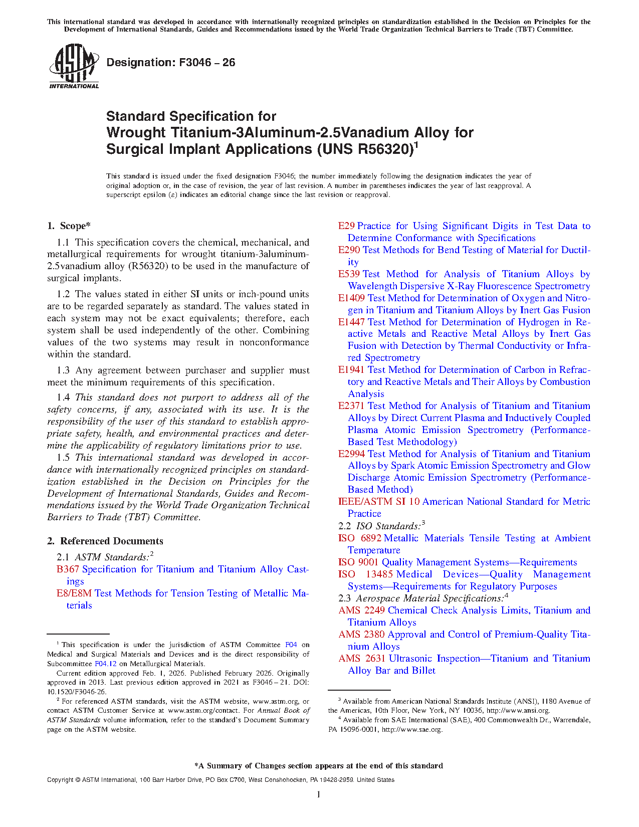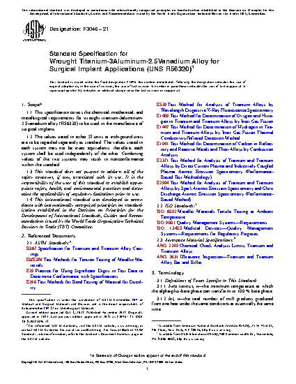This specification establishes the chemical, physical, mechanical, and metallurgical requirements for wrought titanium-3aluminum-2.5vanadium alloy (R56320) to be used in the manufacture of surgical implants. It covers various titanium mill products that are normally formed with the conventional forging and rolling equipment found in primary ferrous and nonferrous plants. The alloy is usually multiple melted in arc furnaces (including furnaces such as plasma arc and electron beam) of a type conventionally used for reactive metals.