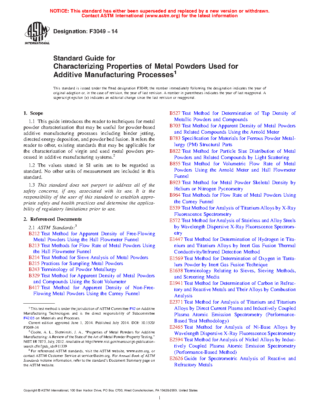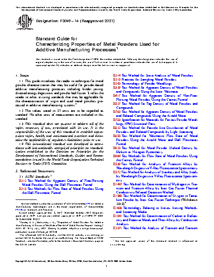 4.1 Determining the properties of the feedstock powder used in these processes is a necessary condition for industry’s confidence in powder selection and ability to produce consistent components with known and predictable properties. The intention of this guide is to provide purchasers, vendors, or producers of metal powder to be used in additive manufacturing processes with a reference for existing standards or variations of existing standards that may be used to characterize properties of metal powders used for additive manufacturing processes. It will serve as a starting point for the future development of a suite of specific standard test methods that will address each individual property or property type that is important to the performance of metal-based additive manufacturing systems and the components produced by them. While the focus of this standard is on metal powder, some of the referenced methods may also be appropriate for non-metal powders.