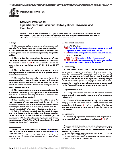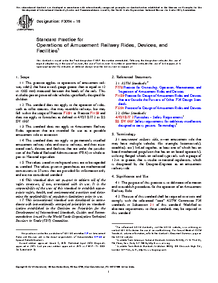 1.2 This standard does not apply to the operation of rides, such as roller coasters, that resemble railways, but fall within the scope of Practice F2291-22a or Practice F1159-16e1. This standard also does not apply to funiculars as defined in ANSI B77.2-20 or BS EN 1907-17.