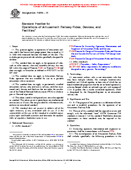 1.1 This practice applies to operations of amusement railway ride(s) that have a track gauge greater than or equal to 12 in. (305 mm) measured between the heads of the rails. This excludes patron powered ride vehicles specifically designed for children.
