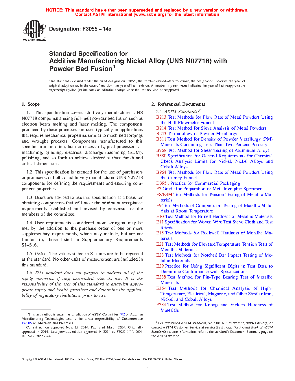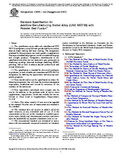 This specification defines the requirements for additive manufacturing of nickel alloy (UNS N07718) using full-melt powder bed fusion such as electron beam melting and laser melting. The standard may be used by purchasers and producers of additively manufactured UNS N07718 components to specify the requirements and ensure component properties, and by users to obtain components that will satisfy the minimum acceptance requirements. The standard covers terminology and classification as well as the requirements with respect to ordering information, manufacturing plan, feedstock, thermal processing, chemical composition, microstructure, mechanical properties, hot isostatic pressing, dimensions and permissible variations, retests, inspection, rejection, certification, product marking and packaging, maintenance of a quality program, and the significance of numerical limits.