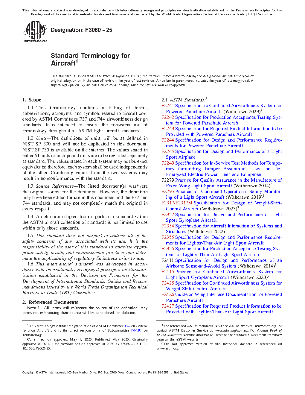 1.1 This terminology contains a listing of terms, abbreviations, acronyms, and symbols related to aircraft covered by ASTM Committees F37 and F44 airworthiness design standards. It is intended to ensure the consistent use of terminology throughout all ASTM light aircraft standards.