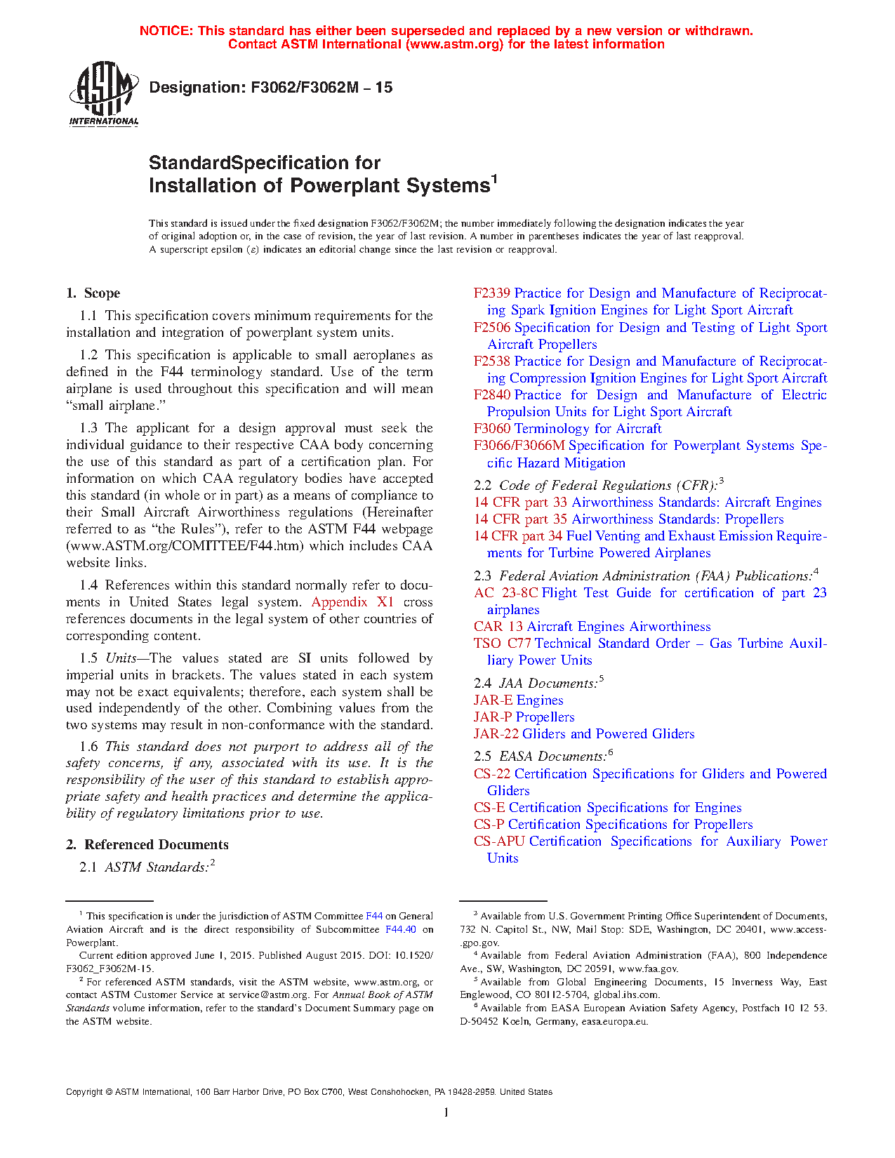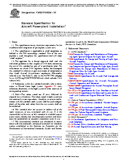 This specification provides minimum requirements for the installation and integration of powerplant system units and is applicable to small aeroplanes as defined in the F44 terminology standard. The applicant for a design approval must seek the individual guidance to their respective civil aviation authority (CAA) body concerning the use of this specification as part of a certification plan.
