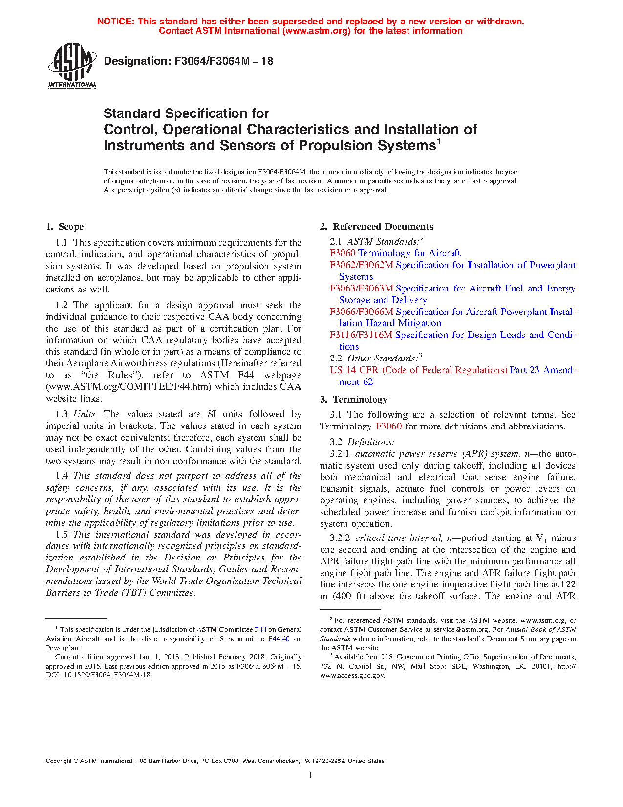This specification provides minimum requirements for the control, indication, and operational characteristics of propulsion systems. It was developed based on propulsion system installed on aeroplanes, but may be applicable to other applications. The applicant for a design approval must seek the individual guidance to their respective civil aviation authority (CAA) body concerning the use of this specification as part of a certification plan.