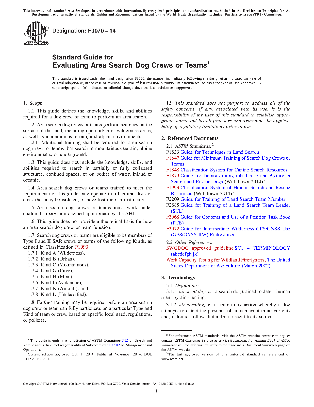 1.4 Area search dog crews or teams trained to meet the requirements of this guide may operate in urban and disaster areas that may be isolated, or have lost their infrastructure.