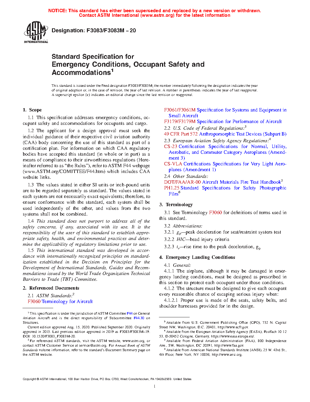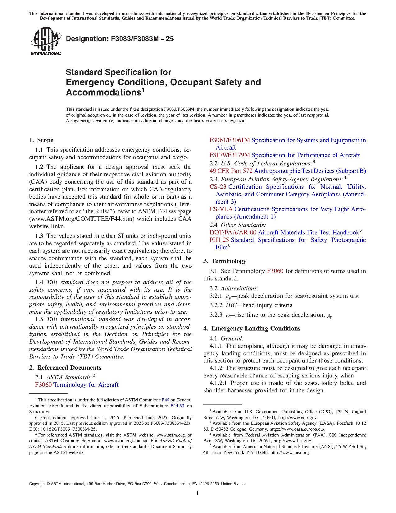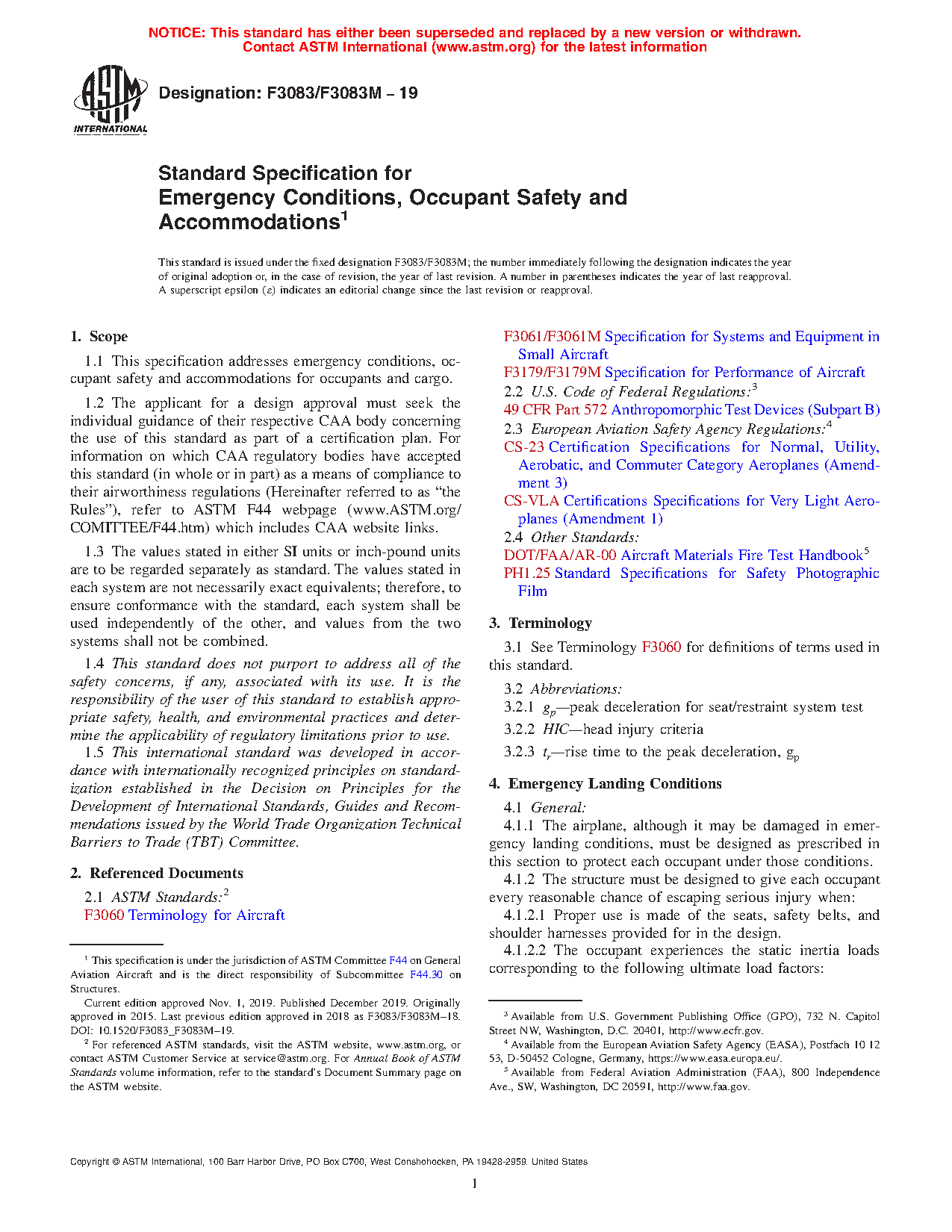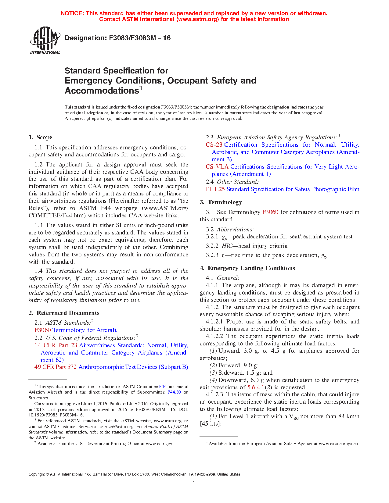 This specification covers emergency conditions, occupant safety and accommodations for occupants and cargo. The applicant for a design approval must seek the individual guidance of their respective civil aviation authority (CAA) body concerning the use of this standard as part of a certification plan.