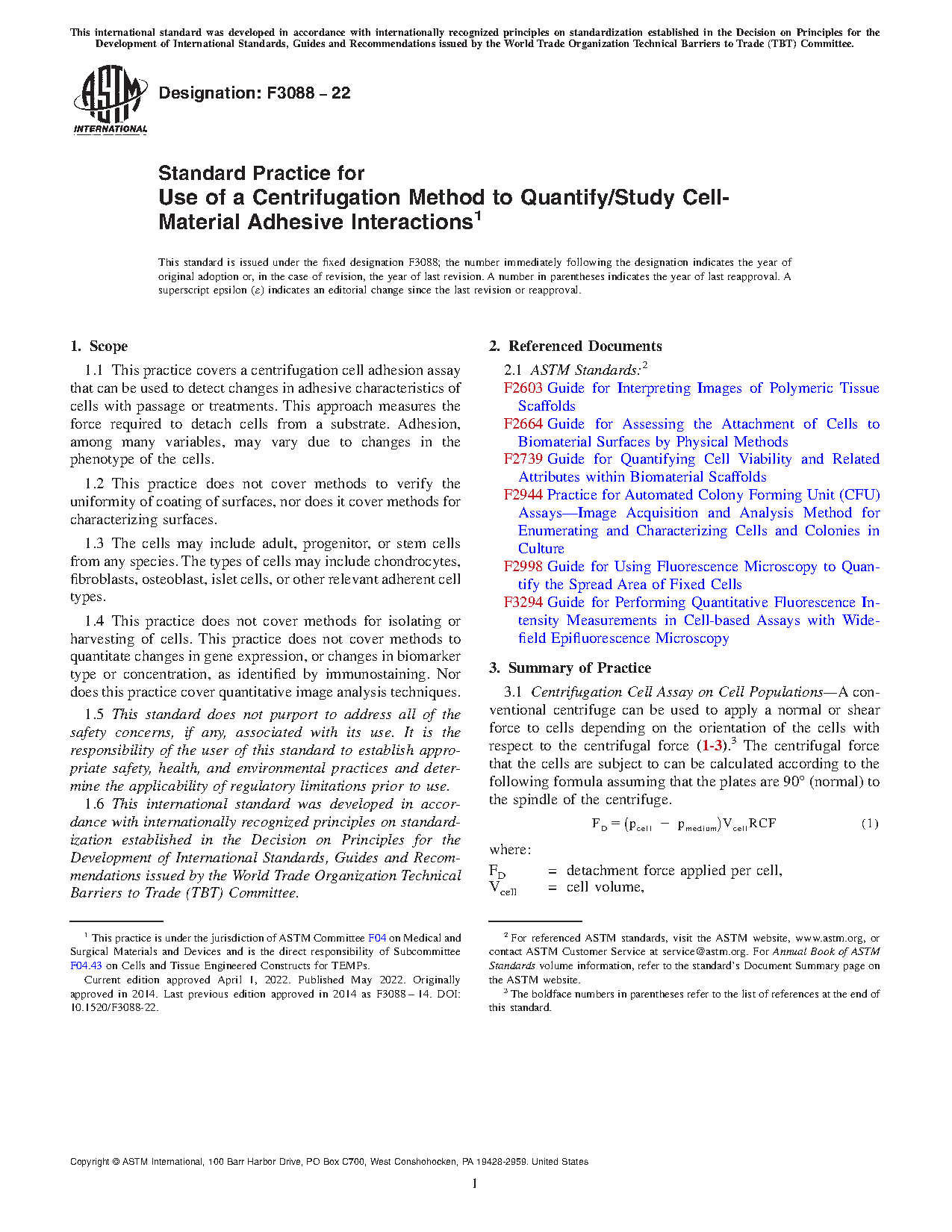 1.1 This practice covers a centrifugation cell adhesion assay that can be used to detect changes in adhesive characteristics of cells with passage or treatments. This approach measures the force required to detach cells from a substrate. Adhesion, among many variables, may vary due to changes in the phenotype of the cells.