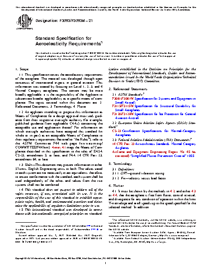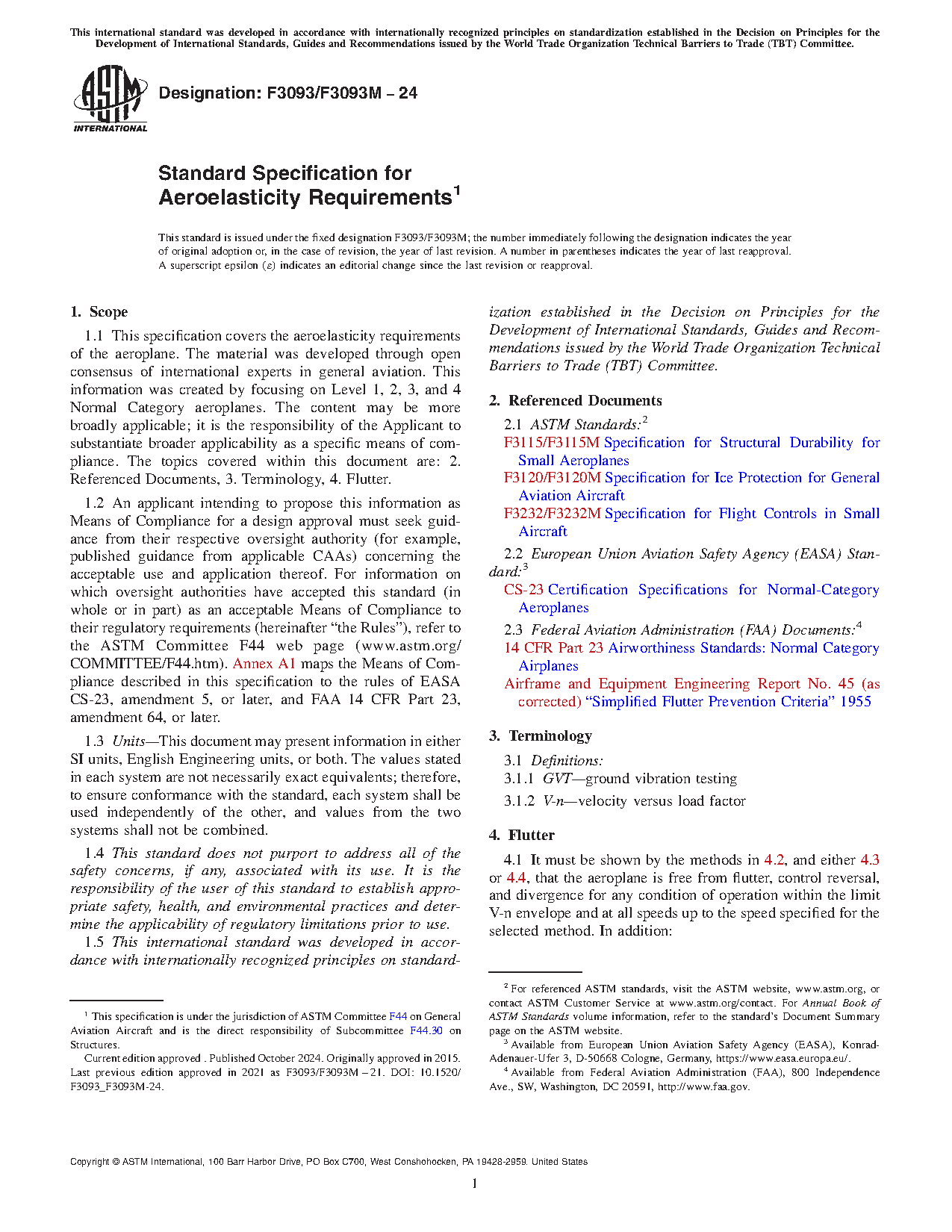 1.1 This specification covers the aeroelasticity requirements of the aeroplane. The material was developed through open consensus of international experts in general aviation. This information was created by focusing on Level 1, 2, 3, and 4 Normal Category aeroplanes. The content may be more broadly applicable; it is the responsibility of the Applicant to substantiate broader applicability as a specific means of compliance. The topics covered within this document are: 2. Referenced Documents, 3. Terminology, 4. Flutter.
