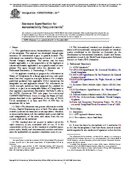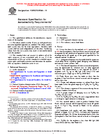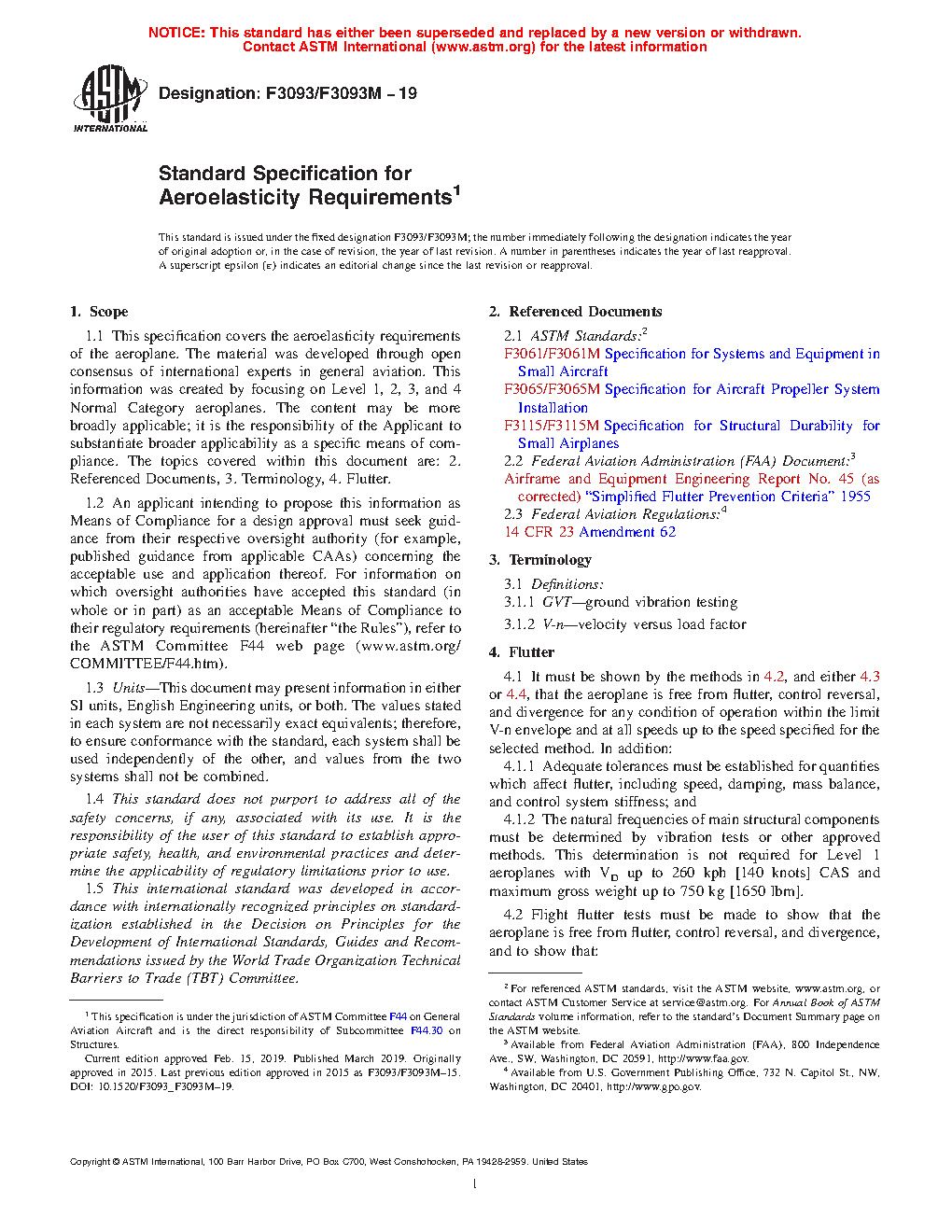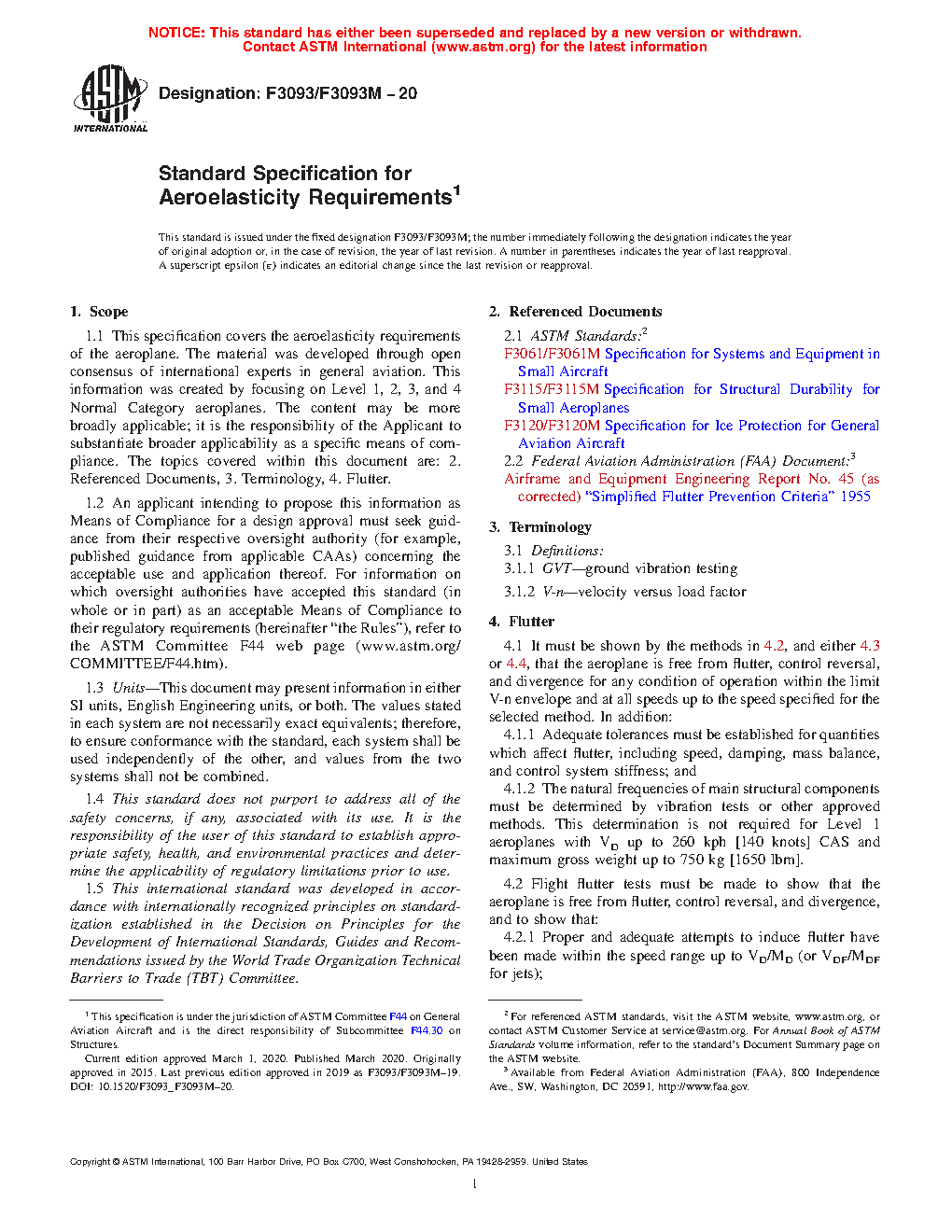 1.1 This specification covers the aeroelasticity requirements of the aeroplane. The material was developed through open consensus of international experts in general aviation. This information was created by focusing on Level 1, 2, 3, and 4 Normal Category aeroplanes. The content may be more broadly applicable; it is the responsibility of the Applicant to substantiate broader applicability as a specific means of compliance. The topics covered within this document are: 2. Referenced Documents, 3. Terminology, 4. Flutter.