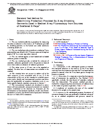 1.1 This test method establishes a procedure for measuring the relative reduction in the intensity of X-radiation provided by shielding garments to the human user under conditions simulating actual use.