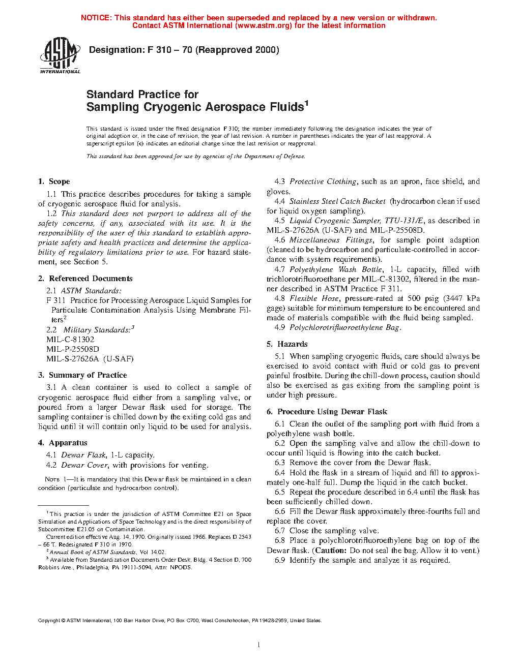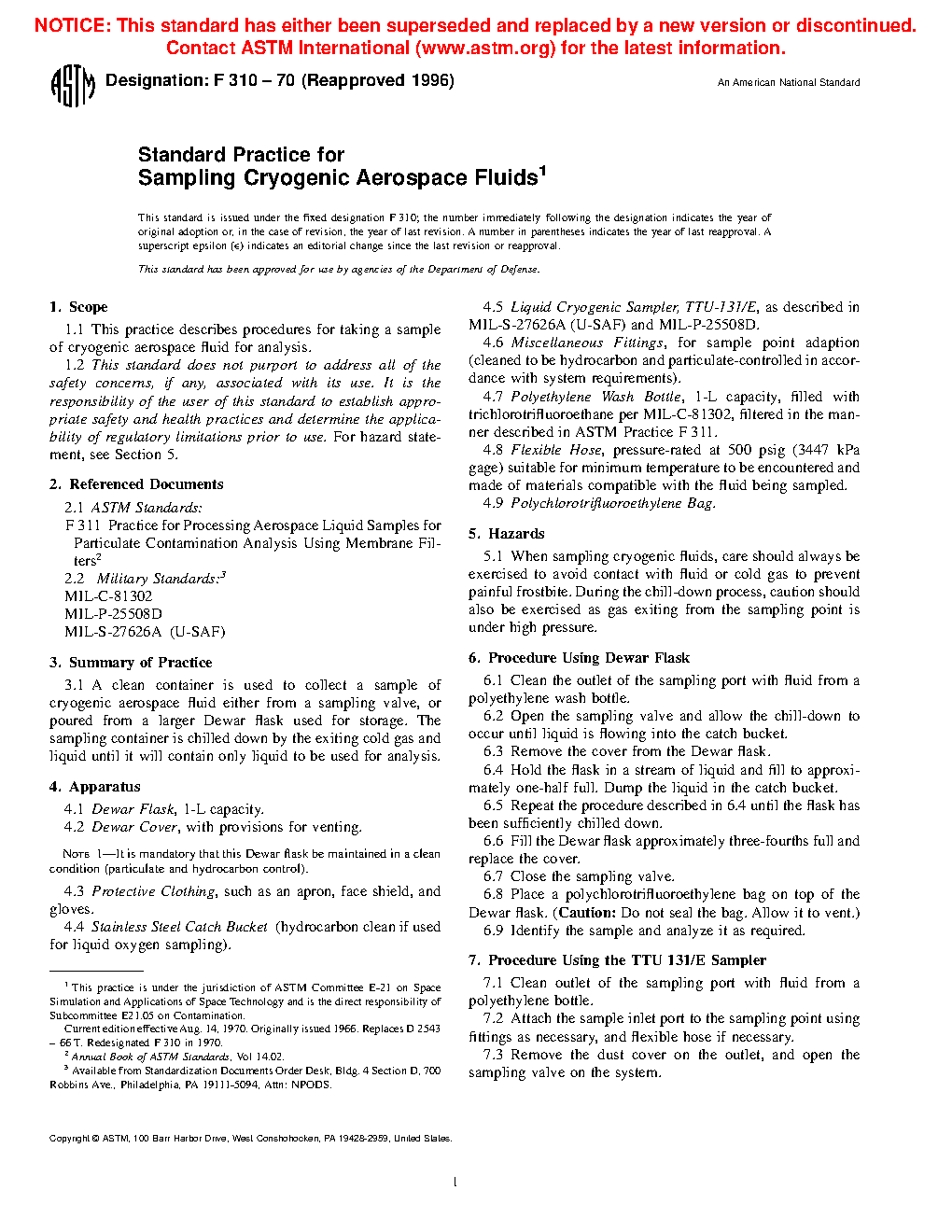 This practice establishes the apparatuses and materials needed, possible hazards, and two standard procedures for taking samples of cryogenic aerospace fluids for analysis. For the Dewar flask procedure, a clean Dewar flask is used to collect a sample of cryogenic aerospace fluid either from a sampling valve, or poured from a Dewar flask used for storage. Whereas, for the cryogenic sampler procedure, the sampler is used to withdraw a small amount of liquefied gas from a large supply, and is then allowed to cool until a steady stream of cryogenic liquid exists in the sampler. Once the sampling valves are closed, the trapped liquid will convert to gas and pressurize the sampling vessel.