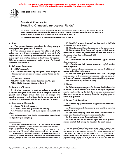 1.1 This practice describes procedures for taking a sample of cryogenic aerospace fluid for analysis.