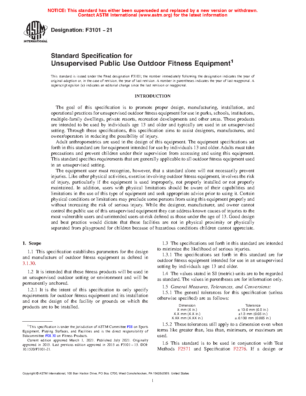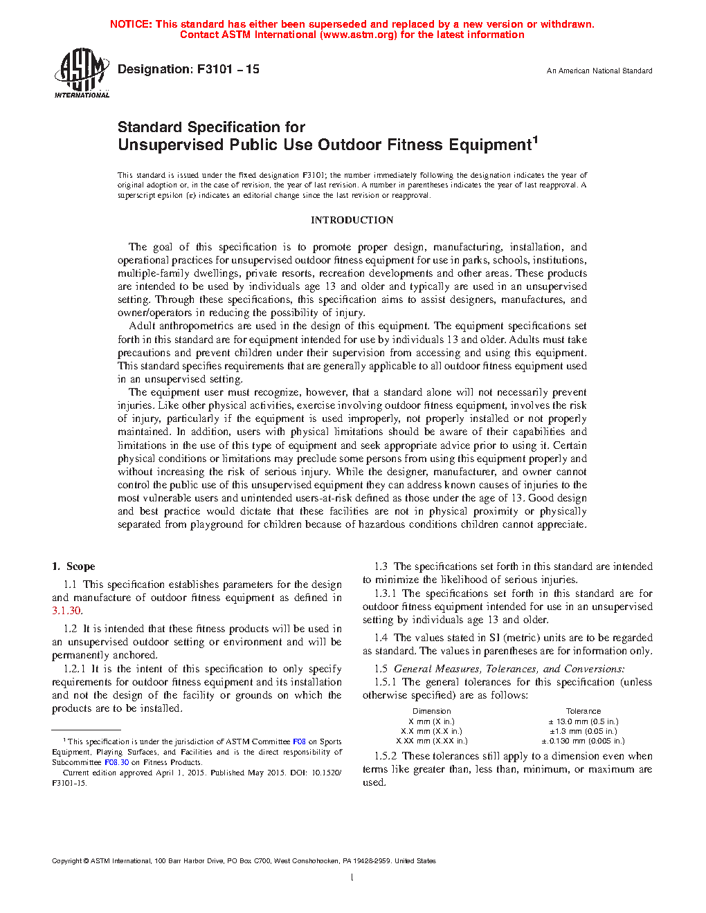 1.3.1 The specifications set forth in this standard are for outdoor fitness equipment intended for use in an unsupervised setting by individuals age 13 and older.