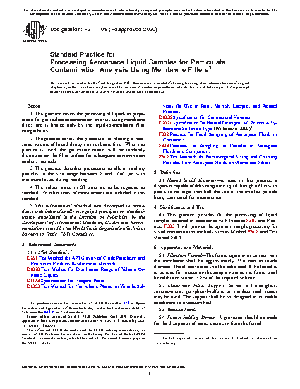 4.1 This practice provides for the processing of liquid samples obtained in accordance with Practice F302 and Practices F303. It will provide the optimum sample processing for visual contamination methods such as Method F312, and Test Method F314.