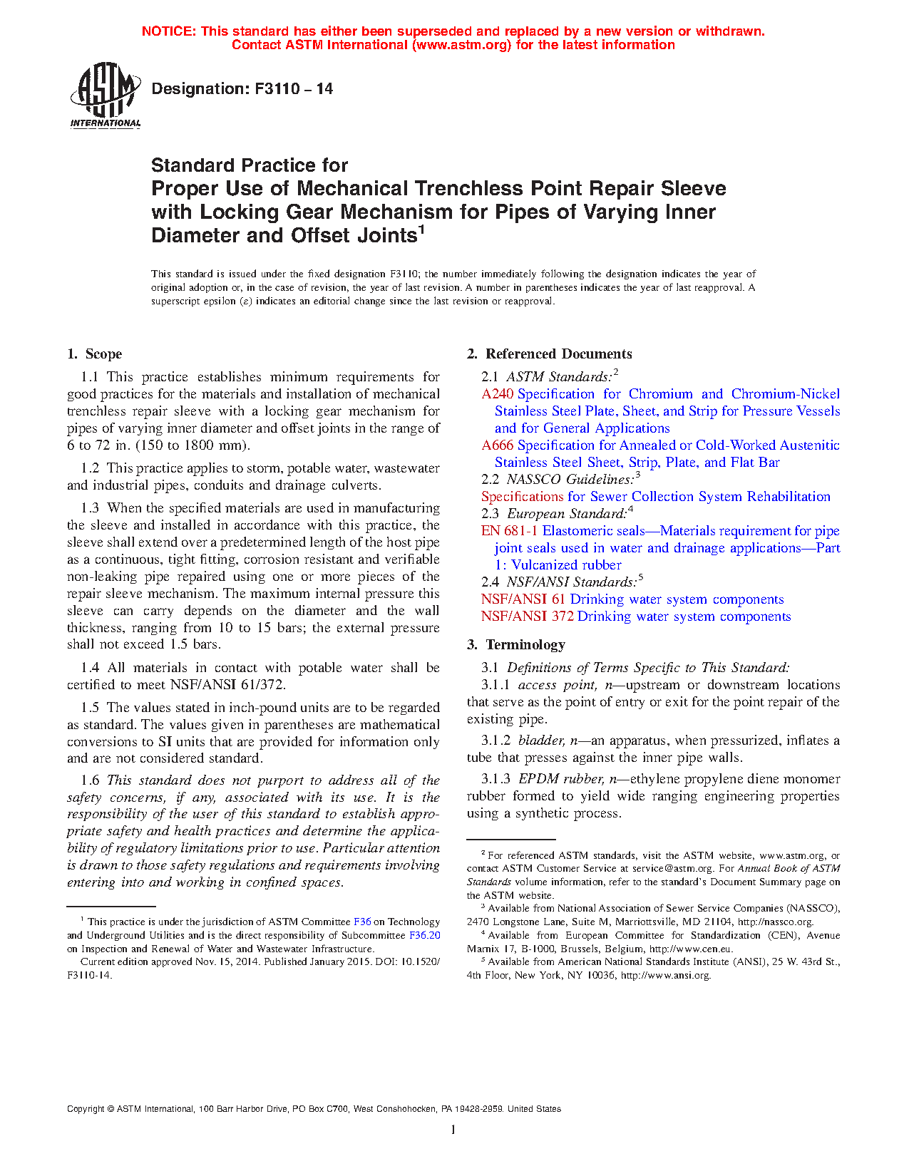 1.1 This practice establishes minimum requirements for good practices for the materials and installation of mechanical trenchless repair sleeve with a locking gear mechanism for pipes of varying inner diameter and offset joints in the range of 6 to 72 in. (150 to 1800 mm).