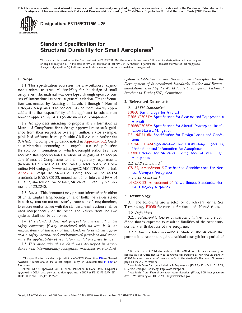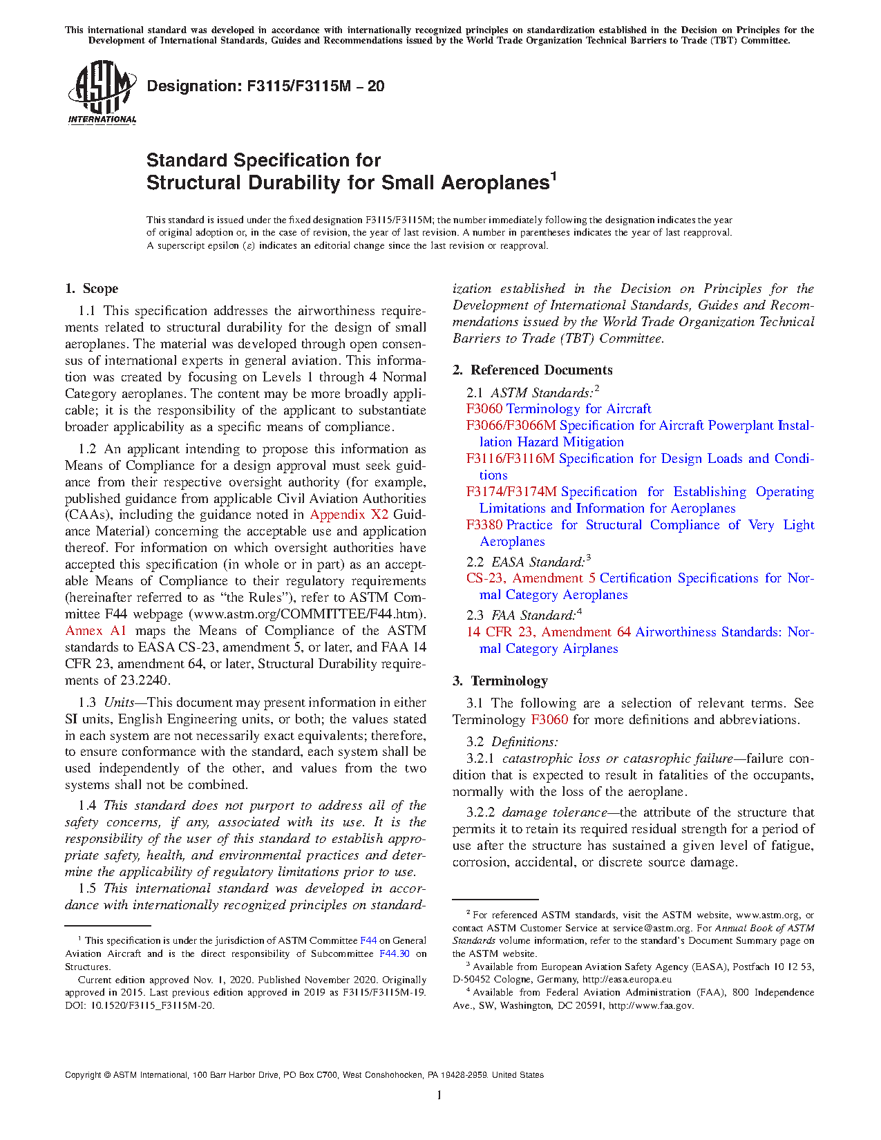 1.2 An applicant intending to propose this information as Means of Compliance for a design approval must seek guidance from their respective oversight authority (for example, published guidance from applicable Civil Aviation Authorities (CAAs), including the guidance noted in Appendix X2, Guidance Material) concerning the acceptable use and application thereof. For information on which oversight authorities have accepted this specification (in whole or in part) as an acceptable Means of Compliance to their regulatory requirements (hereinafter referred to as “the Rules”), refer to ASTM Committee F44 webpage (www.astm.org/COMMITTEE/F44.htm). Appendix X3 maps the Means of Compliance of the ASTM standards to EASA CS-23, amendment 5, or later, and FAA 14 CFR 23, amendment 64, or later, Structural Durability requirements of 23.2240.