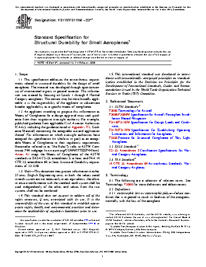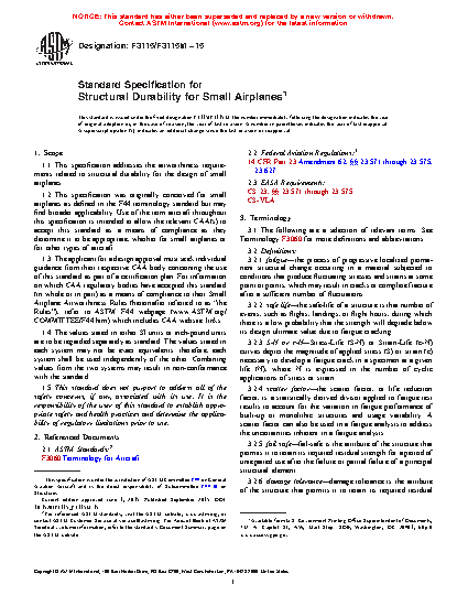 1.1 This specification addresses the airworthiness requirements related to structural durability for the design of small aeroplanes. The material was developed through open consensus of international experts in general aviation. This information was created by focusing on Levels 1 through 4 Normal Category aeroplanes. The content may be more broadly applicable; it is the responsibility of the applicant to substantiate broader applicability as a specific means of compliance.