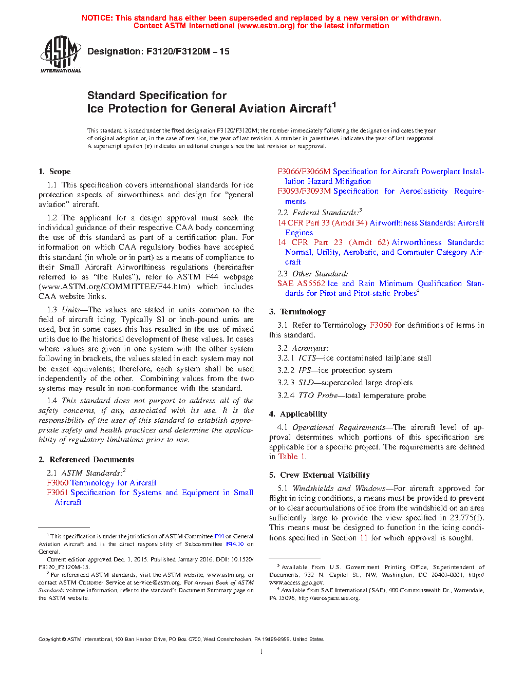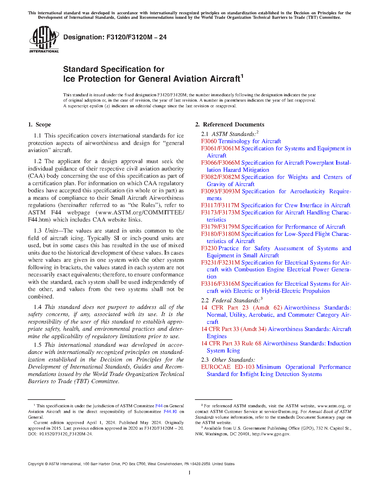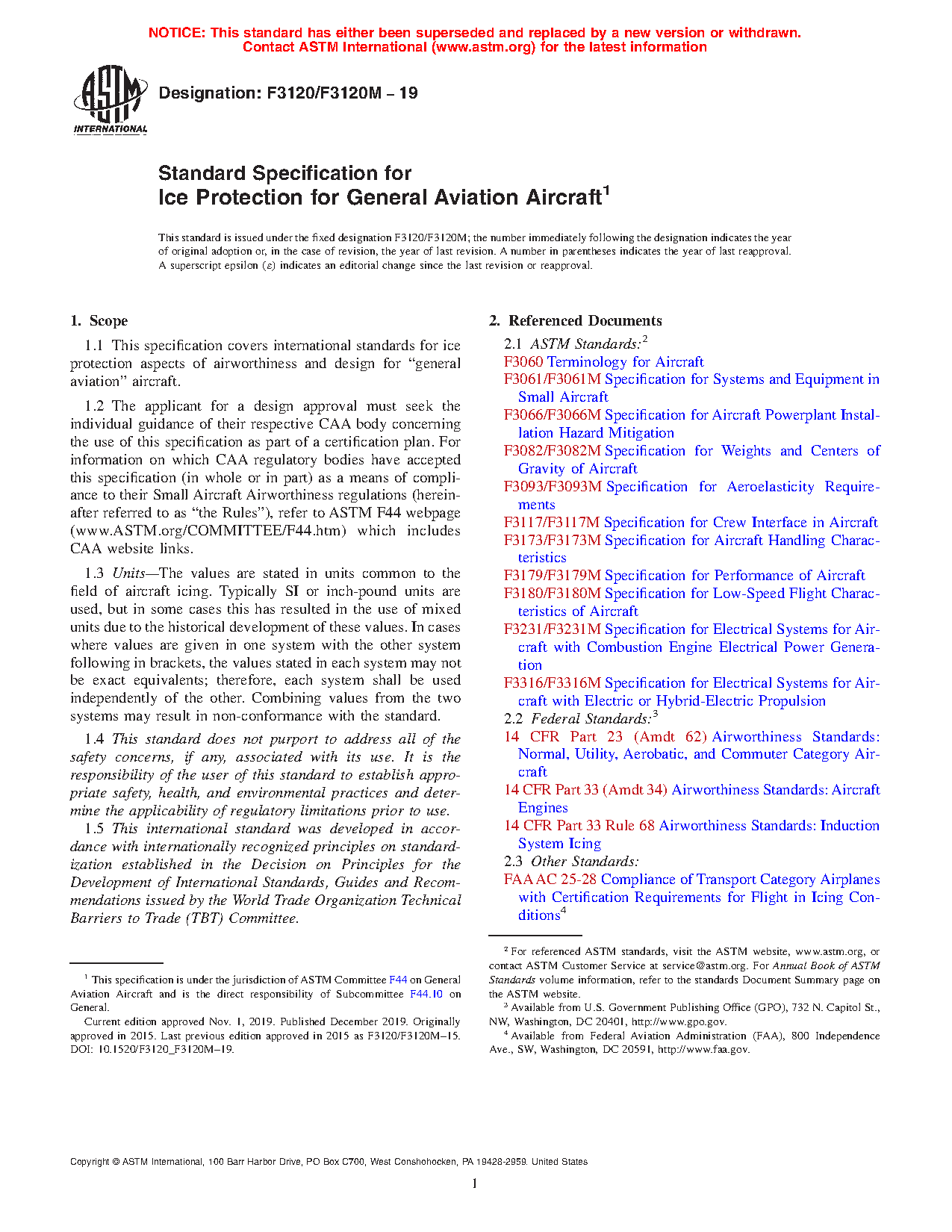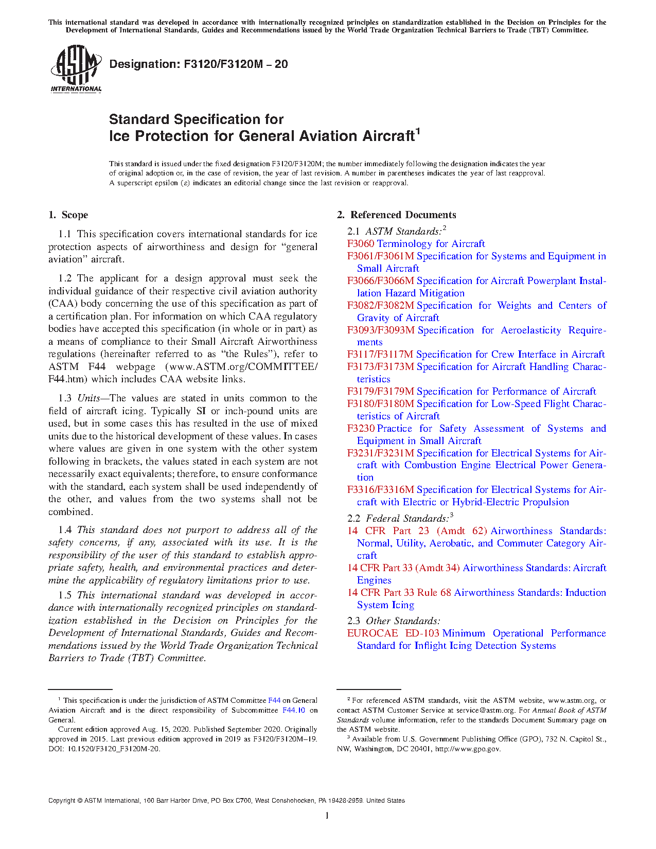 1.1 This specification covers international standards for ice protection aspects of airworthiness and design for “general aviation” aircraft.