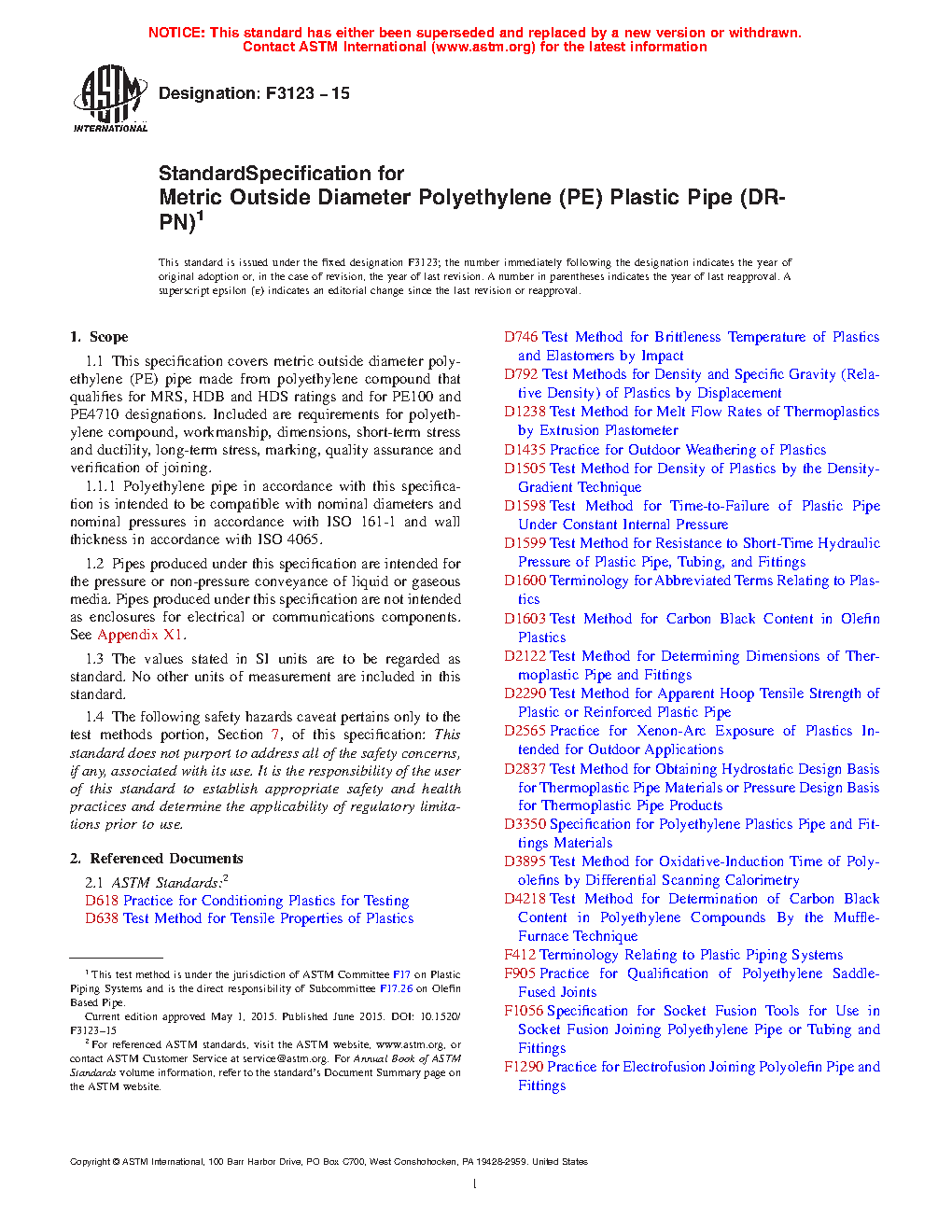 1.1 This specification covers metric outside diameter polyethylene (PE) pipe made from polyethylene compound that qualifies for MRS, HDB and HDS ratings and for PE100 and PE4710 designations. Included are requirements for polyethylene compound, workmanship, dimensions, short-term stress and ductility, long-term stress, marking, quality assurance and verification of joining.