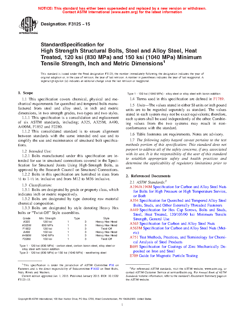 1.1.1 This specification is a consolidation and replacement of six ASTM standards, including; A325, A325M, A490, A490M, F1852 and F2280.