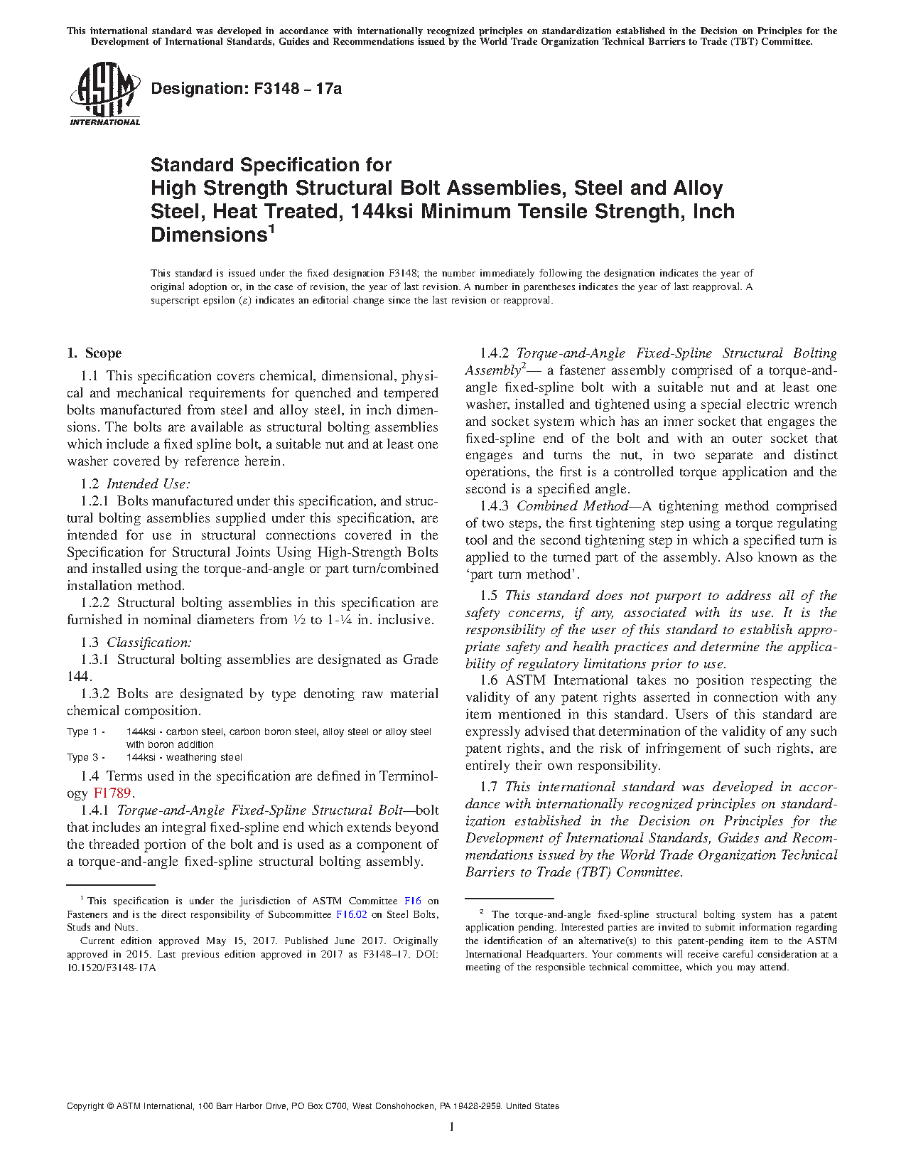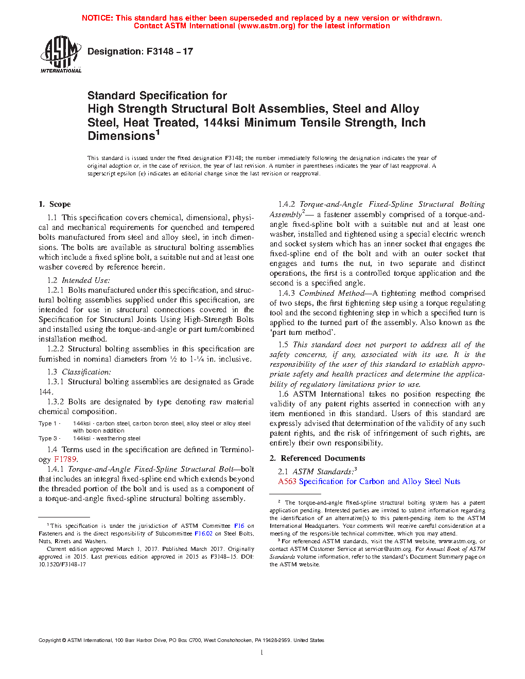 This specification defines chemical, dimensional, physical and mechanical requirements for quenched and tempered bolts manufactured from steel and alloy steel, in inch dimensions. Structural bolting assemblies are designated as Grade 144. Bolts are designated by type denoting raw material chemical composition: Type 1 (144ksi - carbon steel, carbon boron steel, alloy steel or alloy steel with boron addition) and Type 3 (144ksi - weathering steel). Bolts manufactured under this specification, and structural bolting assemblies supplied under this specification, are intended for use in structural connections covered in the Specification for Structural Joints Using High-Strength Bolts and installed using the torque-and-angle or part turn/combined installation method.