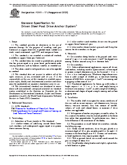 This specification establishes the material requirements and installation procedures for driven steel post drive anchor systems. It provides an alternative to the use of concrete footings for the purpose of installing steel post frameworks to support chain link, expanded metal, welded wire mesh, wood, ornamental, rigid PVC, and composite fence. The drive anchor clamp bracket—the pressed steel fitting that secures the drive anchors to the post—shall be pressed steel, minimum of 11 ga. x 1 in. wide, minimum 1.2 oz/ft² hot dipped zinc coating. The bracket shall be secured using 3/8 in. diameter bolts. Industrial/commercial applications require all driven steel anchors, including round or square sections, to have equal or greater strength characteristics as the historical 1 1/2 in. x 1 1/2 in. x 1/8 in. steel angle irons. Whichever shape is chosen, the yield strength shall be 35,000 psi, maximum bending moment 6,462 lb/in., minimum 1.2 oz/ft² zinc coating, and gripping surface area 3 in.².