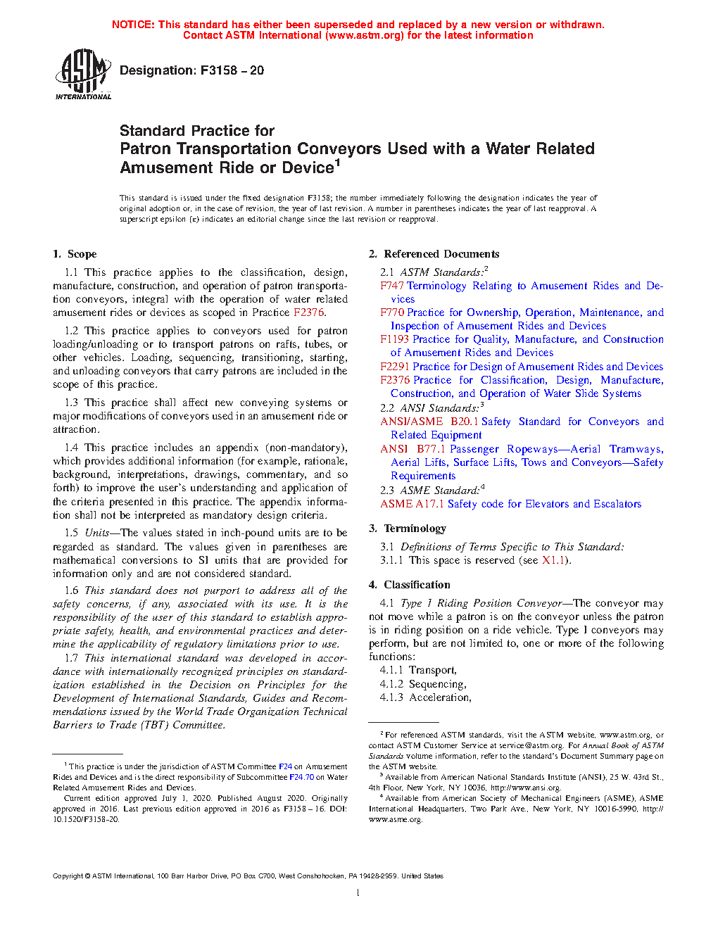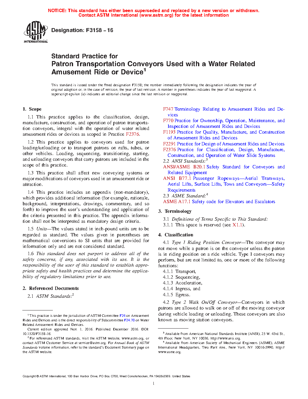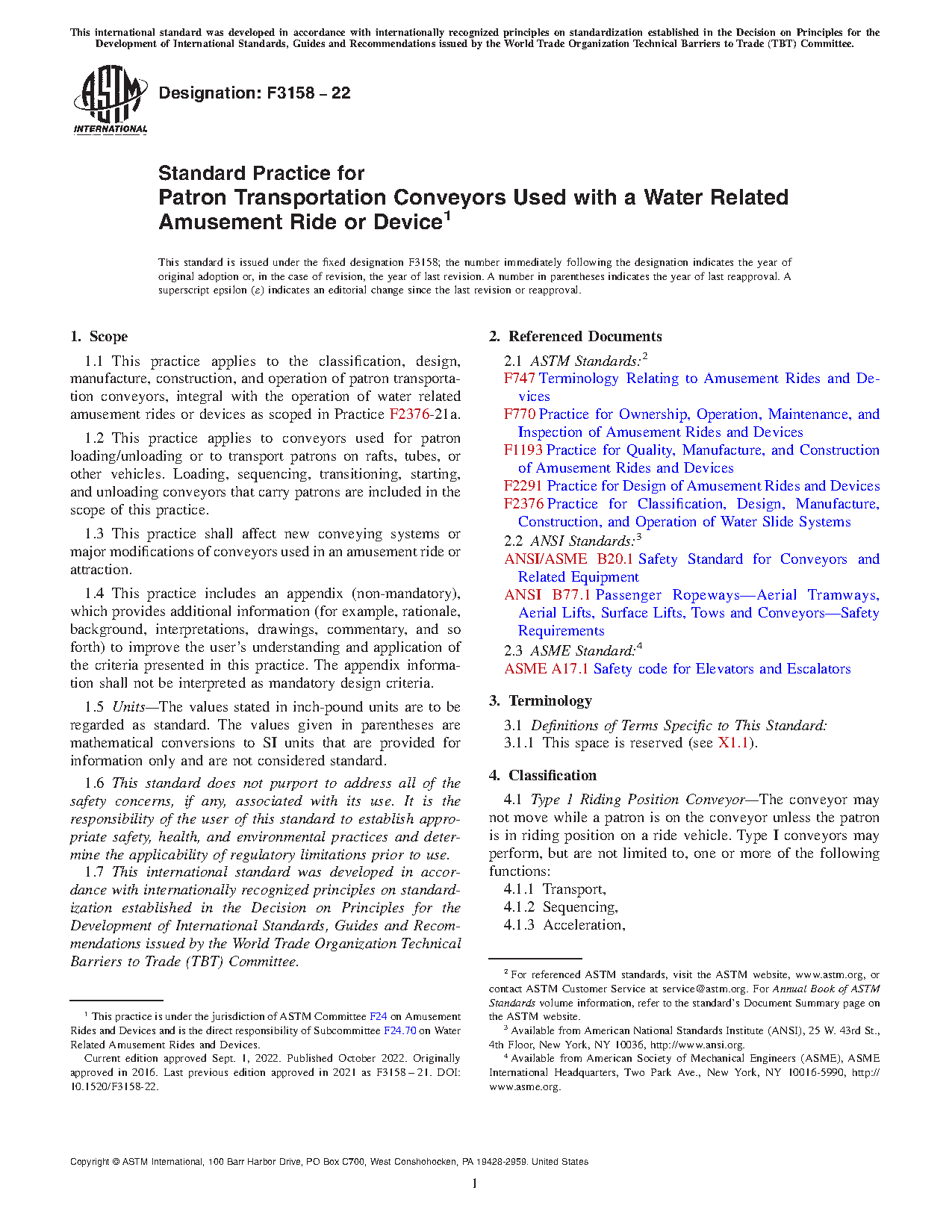 1.1 This practice applies to the classification, design, manufacture, construction, and operation of patron transportation conveyors, integral with the operation of water related amusement rides or devices as scoped in Practice F2376-21a.